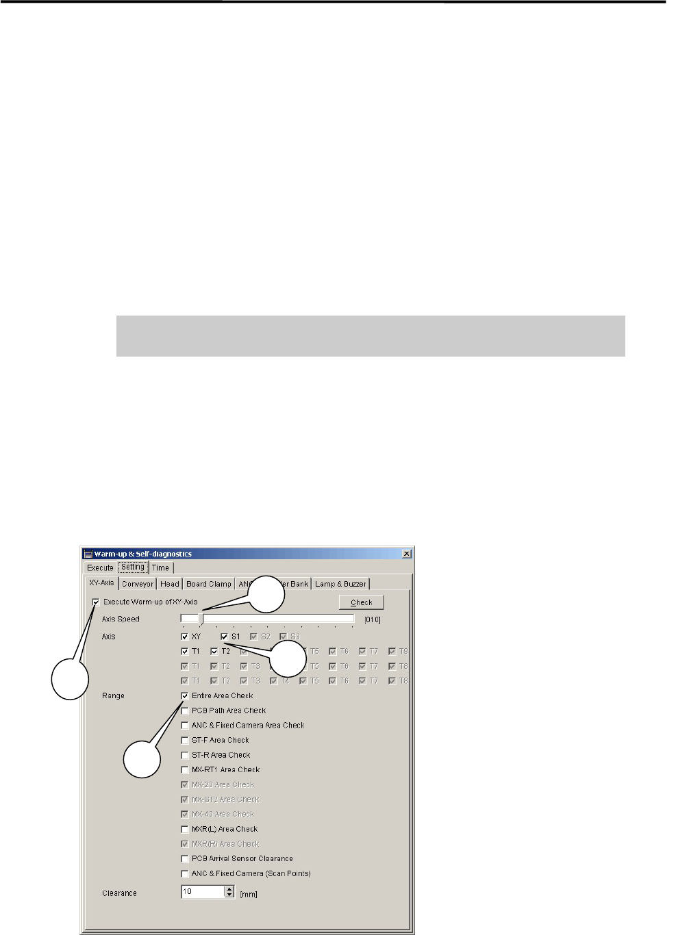 1 Installation 1-13 ⑤ Disable all the parameters in other tab fields than [XY-axes]. Rem ove a check mark on each parameters in [Conveyer], [Head], [Board Clamp], [ANS], [Feeder Bank], and [Lam p & Buzzer] (tabs may …
