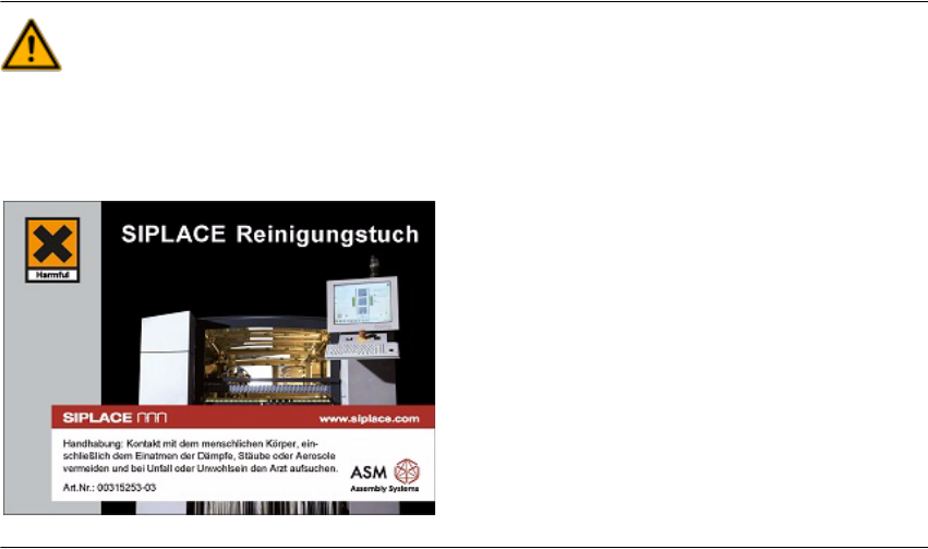 1 Sicherheitshinweise Instandhaltungs anleitung SIPLACE Wafer System 1.3 Generelle Sicherheitshinweise bei Instandhaltungsarbeiten Ab Softwar eversion SR.604 CA.xx Ausgabe 08/2011 DE 10 W ARNUNG 1 SIPLACE-Reinigungstuch …