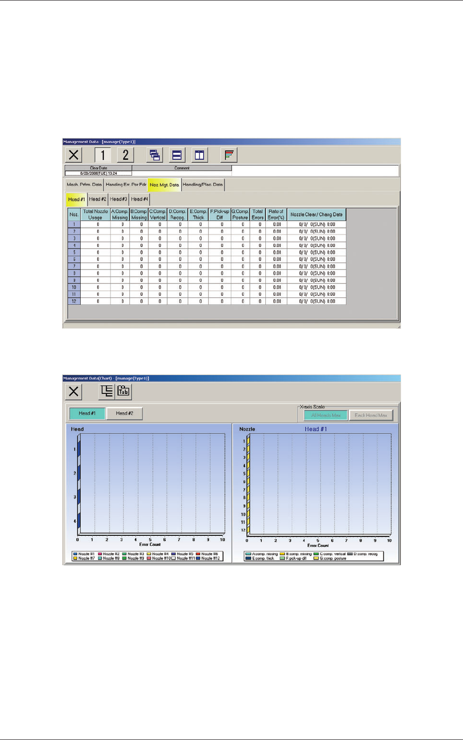 5-19 AKFEDT -ID (1) Noz. Shown are the nozzle Nos. (2) T otal Nozzle Usage Each text box shows the number of pickup actions for each individual nozzles. (3) A: Comp. Missing Each text box shows the number of missing comp…