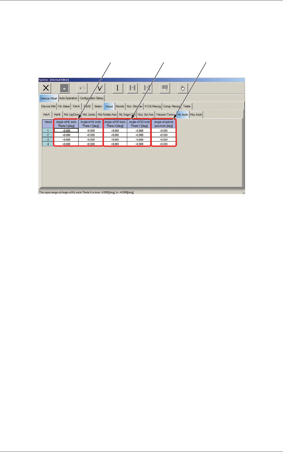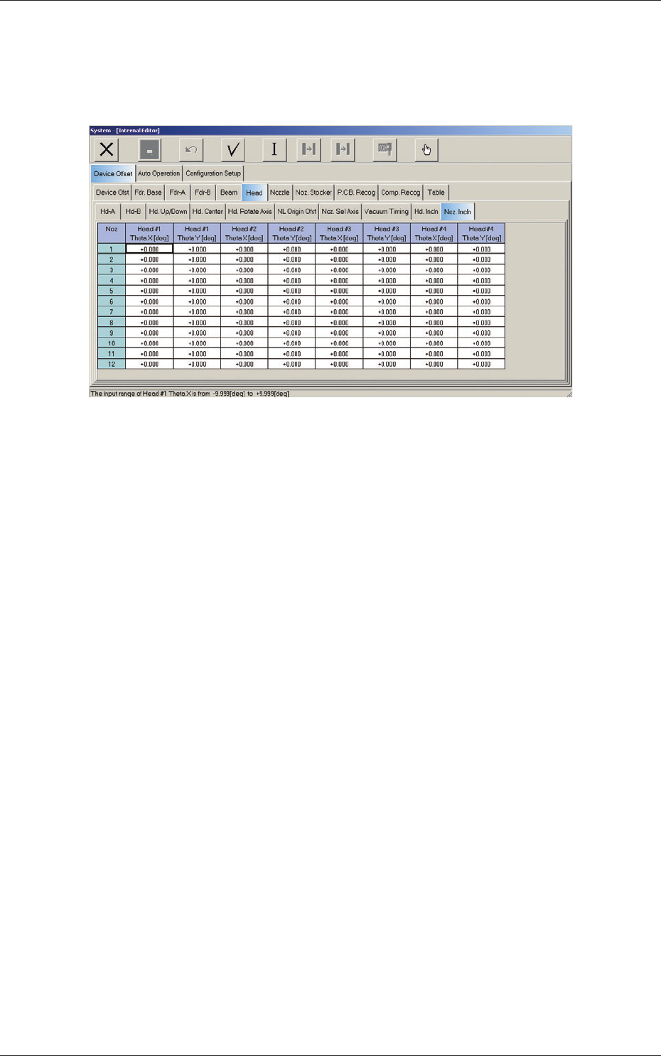 6-33 AKFEDT -ID 2.1.14 Nozzle Inclination Offset When the "Head" tab is pressed in the "Device Offset" tab sheet and the "Noz. Incln" tab is selected, the following tab sheet appears. Fig. 3…