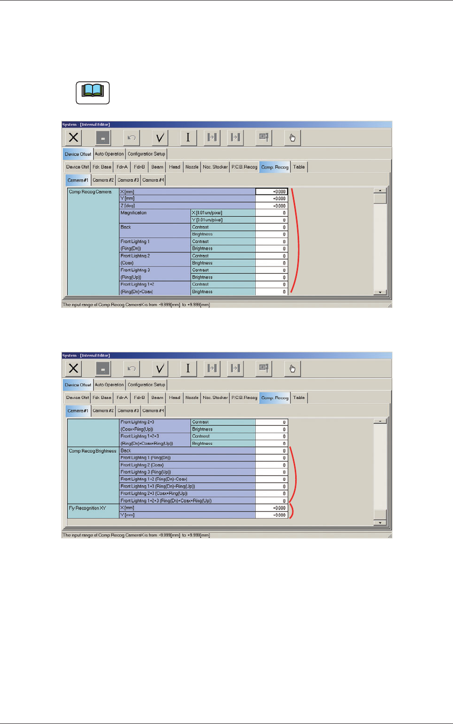 6-46 AKFEDT -ID Magni fi cation X (Horizontal) and Y (V ertical) [0.01 mm/pixel] Set how many micrometers should be equivalent to one pixel to specify the magni fi cation of the PEC recognition camera. The parameters are a…