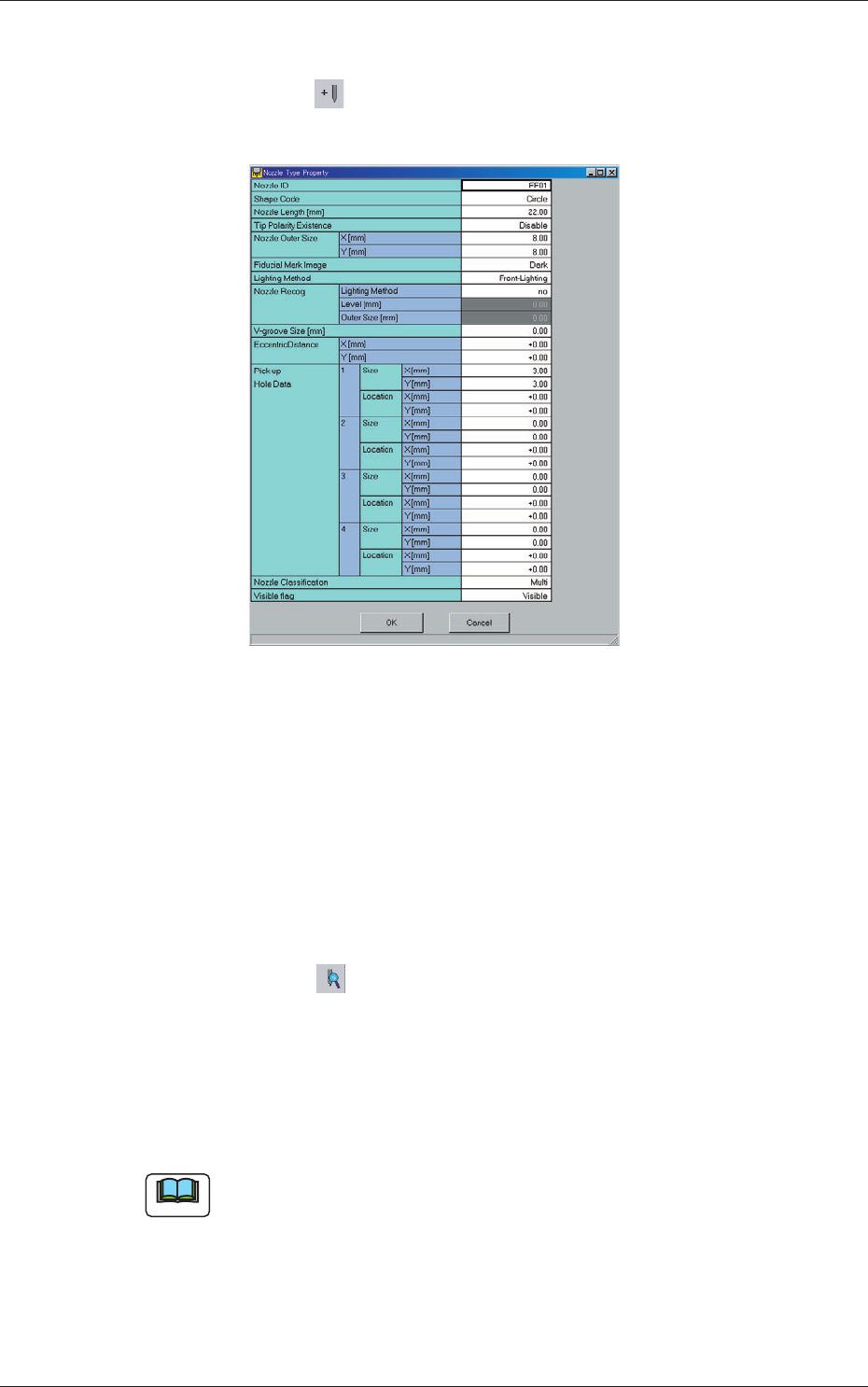 6-84 AKFEDT -ID 3.2.1 Addition of New Nozzle T ype (1) Press the icon ( ). The "Nozzle T ype Property" window opens. Fig. 3F77 (2) Enter parameters (nozzle data) in the text boxes. (3) Press the [OK] button. Th…