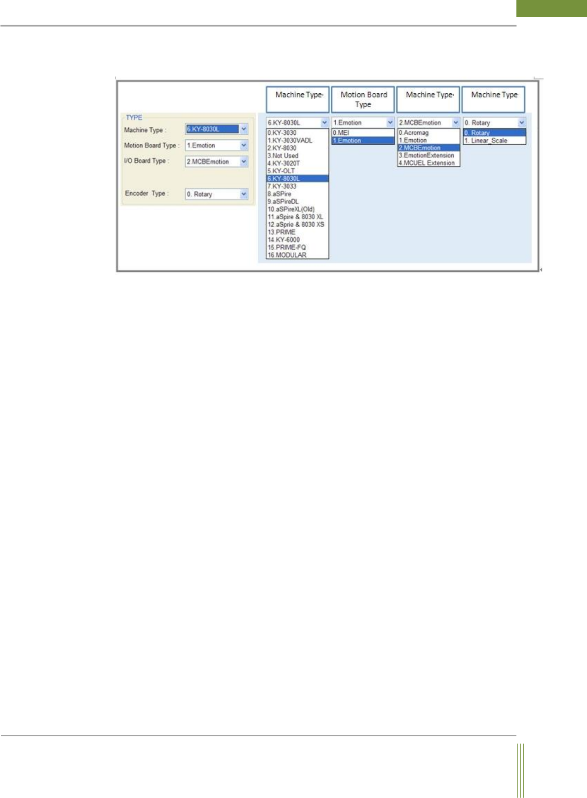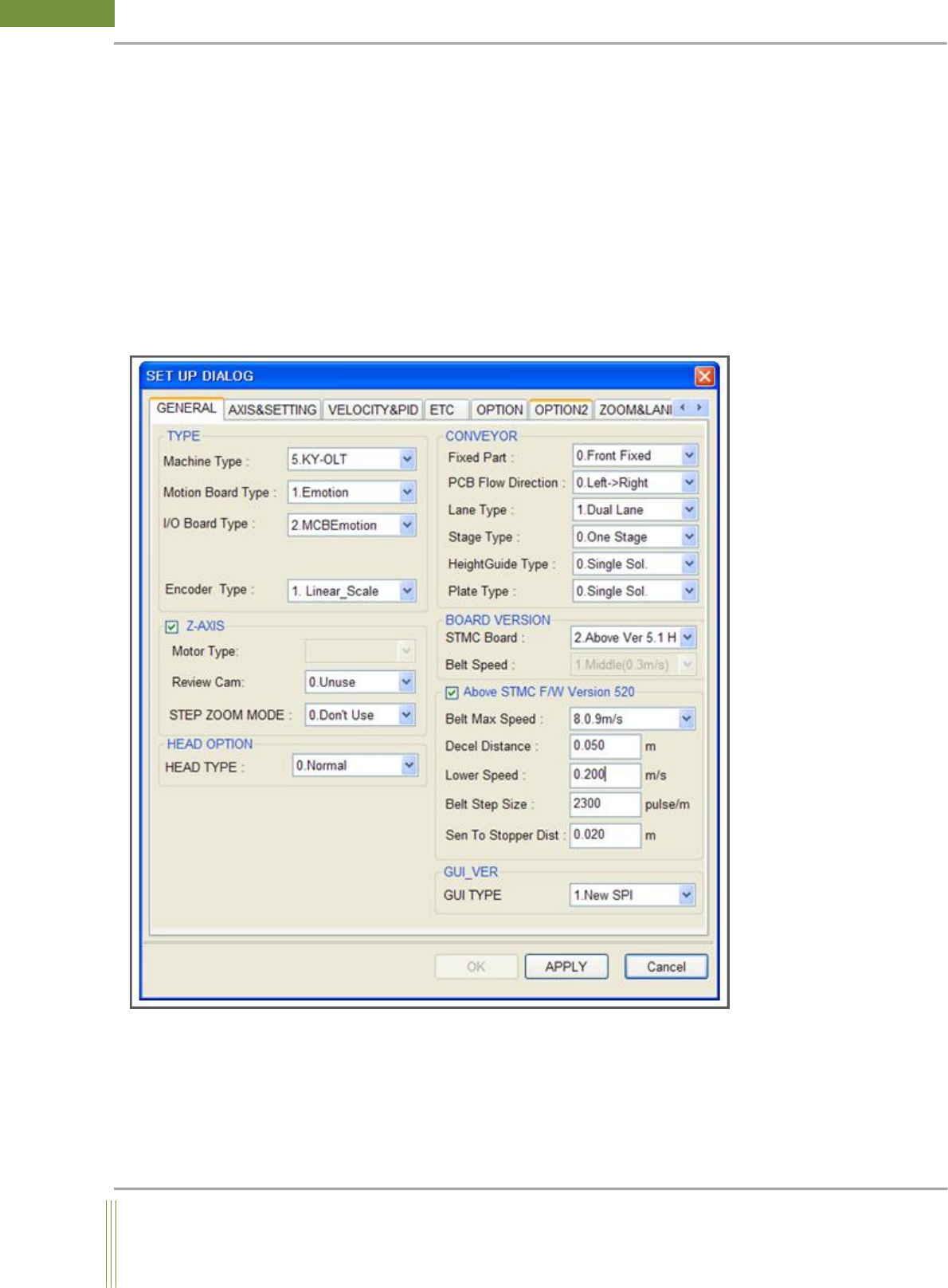 22 WinMCS_Manua l(ENG) rev 1.0 Koh Y oung T echnology Inc. TYPE It is the settings rela ted to Machine T ype, Motion Bo ard T y pe, and I/O Board T ype. 1. Machine T ype Select the machine t ype in use . 2. Motion Boar…