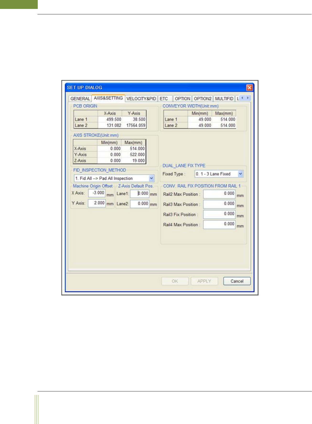 Set up the values such as PCB origin, Conveyor Width, PCB Origin, Focus Position. (Factory