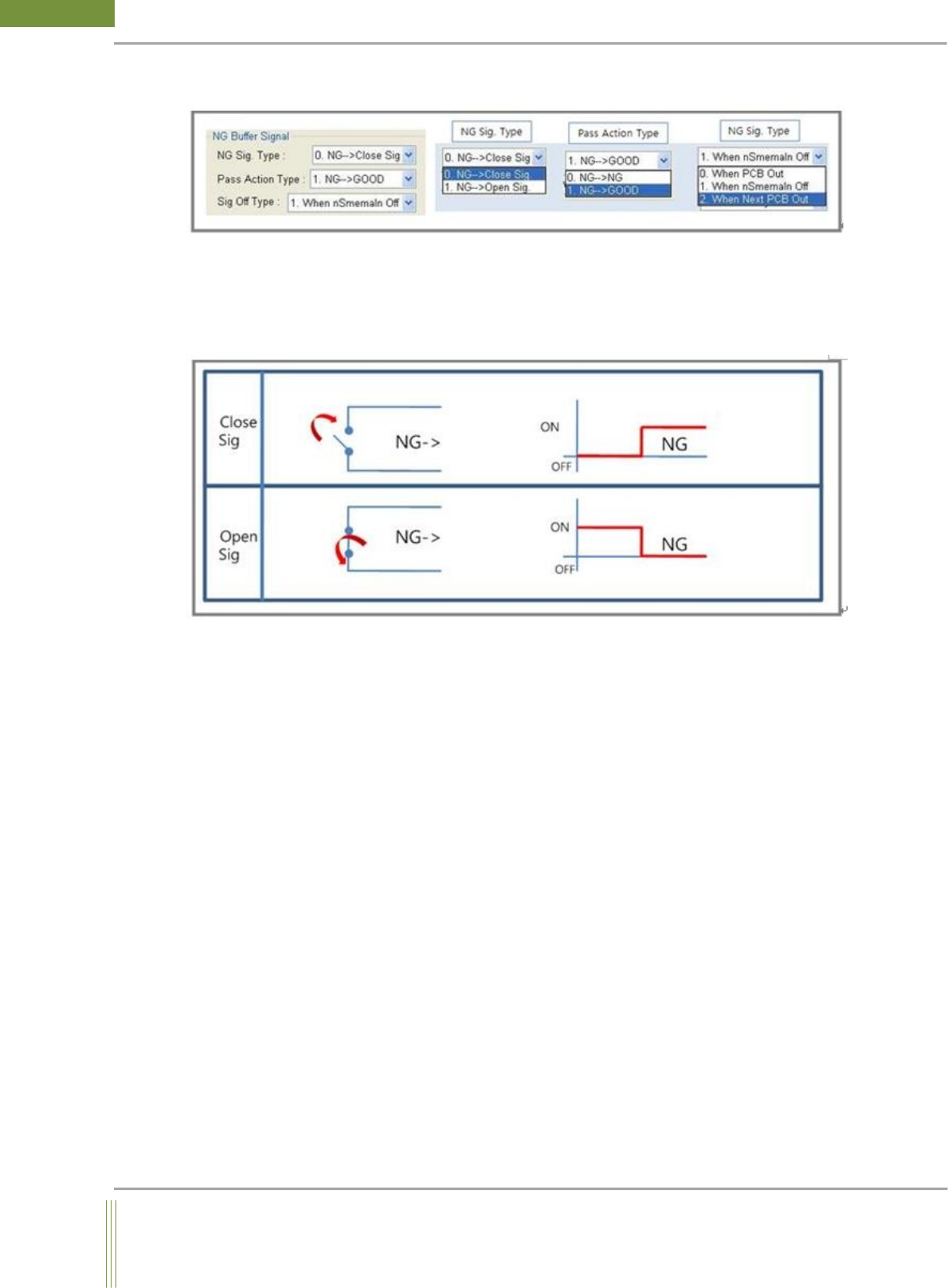 Depending on the type of NG buffer, the sequence of NG signal is different. On Close Sig