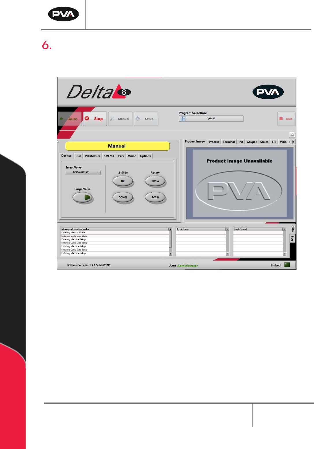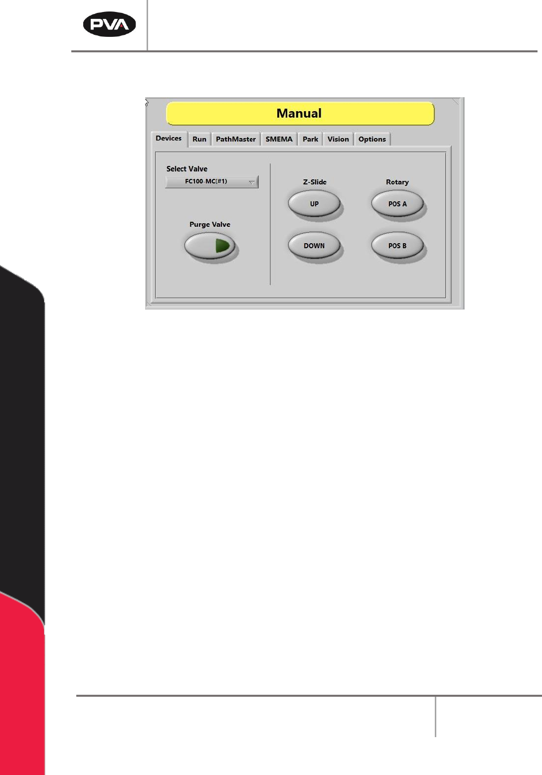 PVA Portal Manual Revision I / Janua ry 2022 Page 21 of 106 6.1 Device Selection Figure 8 : D evice s Tab Workcells with devices have a Devic e Selectio n mode. Select the active head or valve from the drop-dow n m enu u…
