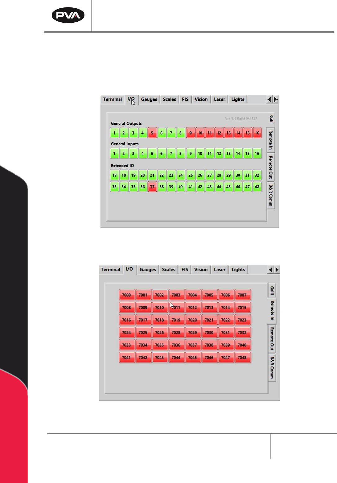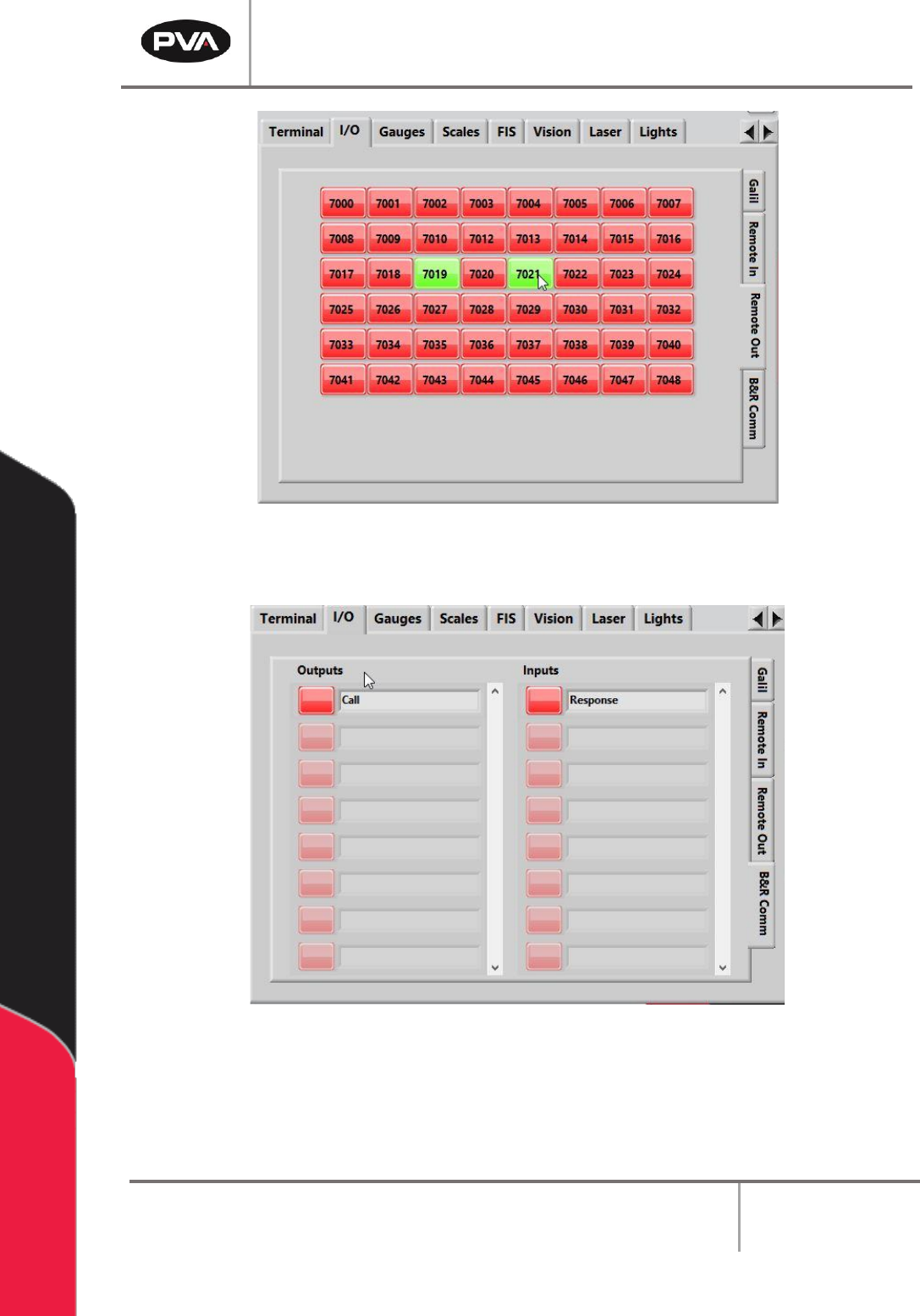PVA Portal Manual Revision I / Janua ry 2022 Page 60 of 106 9.4 I/O The I/O tab contai ns the Galil , Remo te In , Remote Out , and B&R Comm tabs that allow the Inputs to b e verified and the Outputs to be toggl ed o…