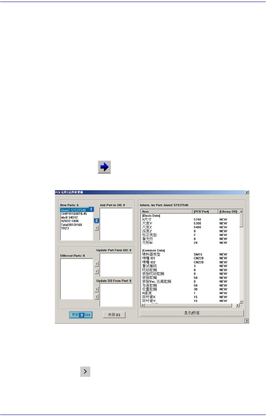 单击 按钮在<New Parts:>列表框或<Different Parts:>列表框中增加要登