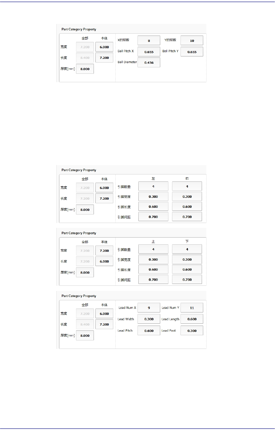 7-17 元件的登记 < 引脚 长 度 ( 上 / 下 / 左 / 右 )> : 引脚的长度 < 引脚 间 距 ( 上 / 下 / 左 / 右 )> : 引脚与引脚之间的间隔 <X/Y 引脚数量 > : 一个边 的 X/Y 方向引脚数量 <Lead Foot> : 引脚接触底部面的长度 ‘ 设置元件类 型 ’ 领 域 设置需要登记的元件的类型。 < 元件形状 …