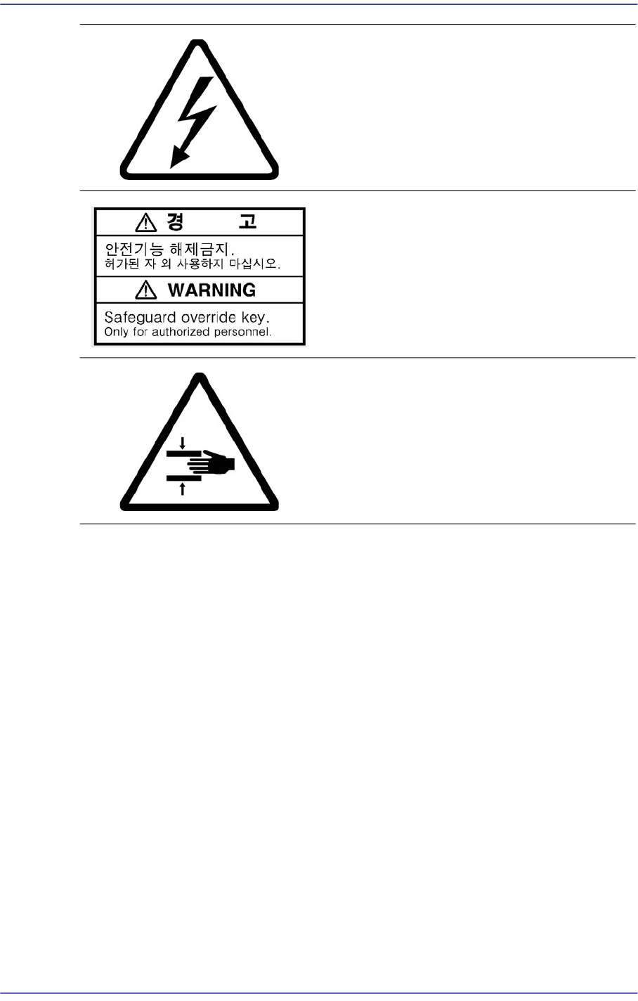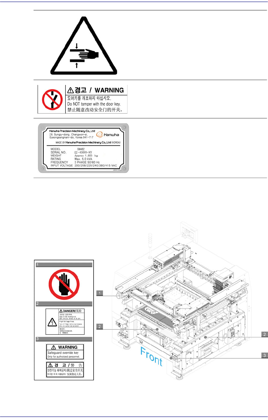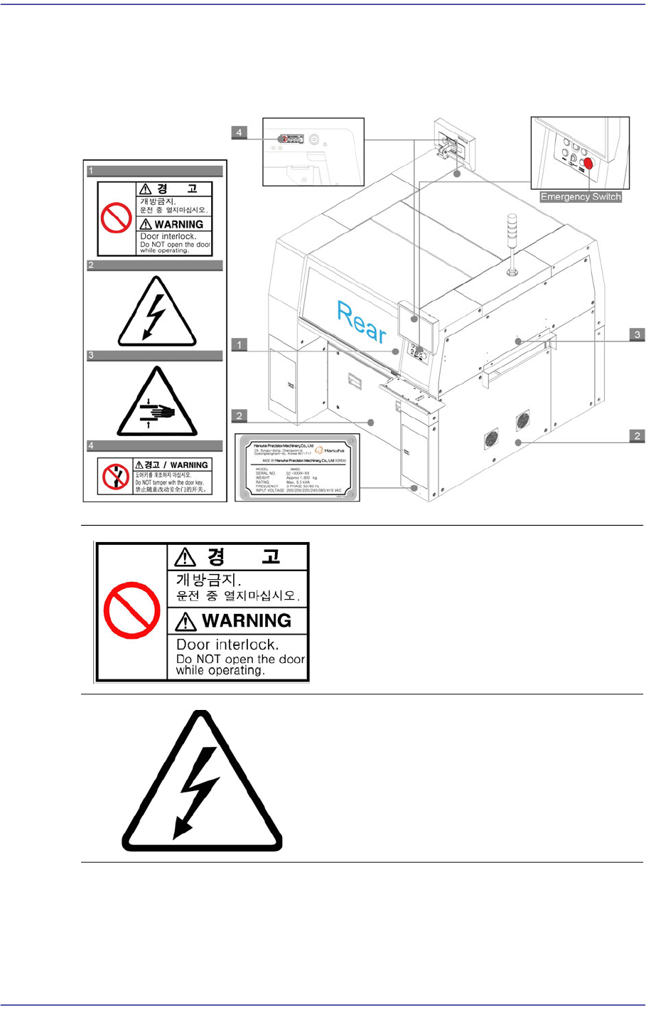 前言 v 设备后面 设备后面贴有以下标签 图 1.2 设备后面的安全标签 运行中请勿打开门 贴有此标签处有移动体, 驱动中打开门把身 体的一部份伸进设备内部时非常危险。 盖内侧及周围连接物部位存在高电压要注意 电击危险。 在维护和修理设备操作时一定要先切断主电 源。