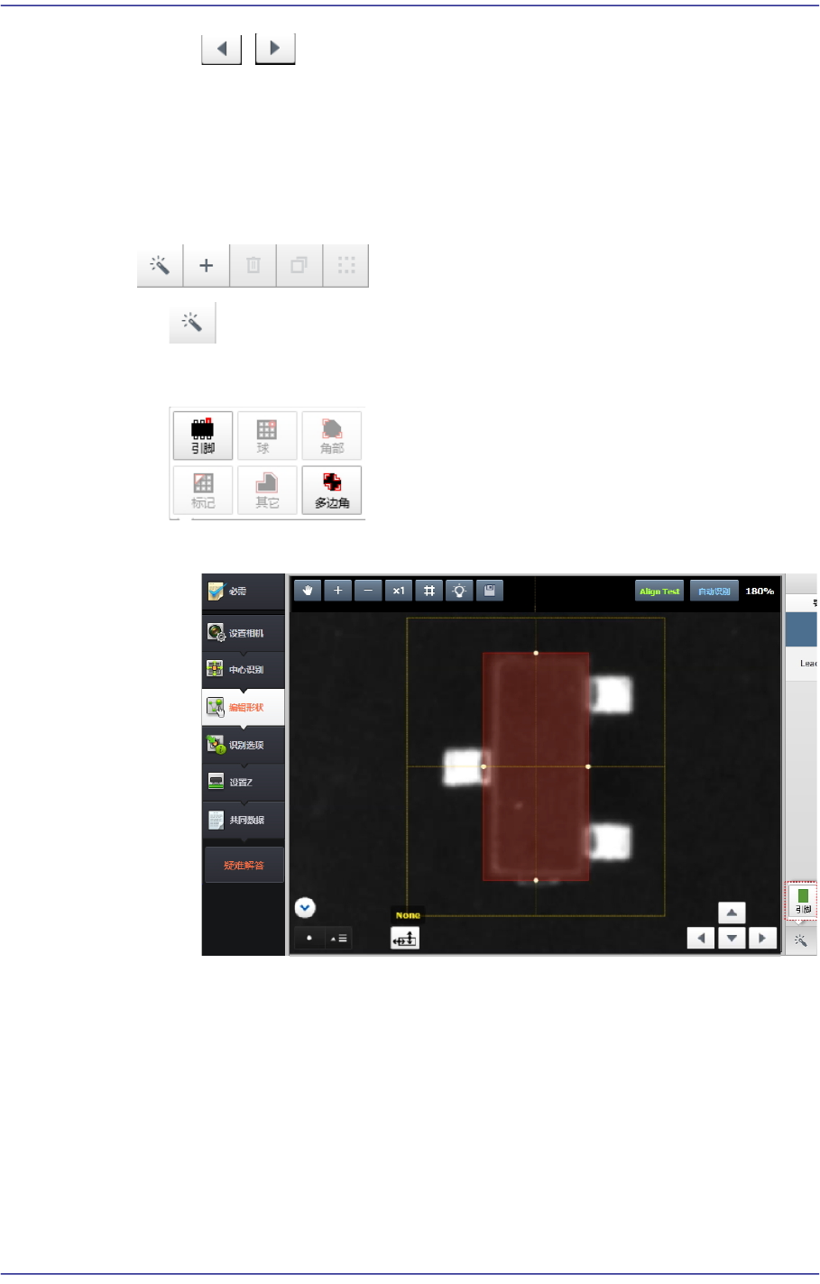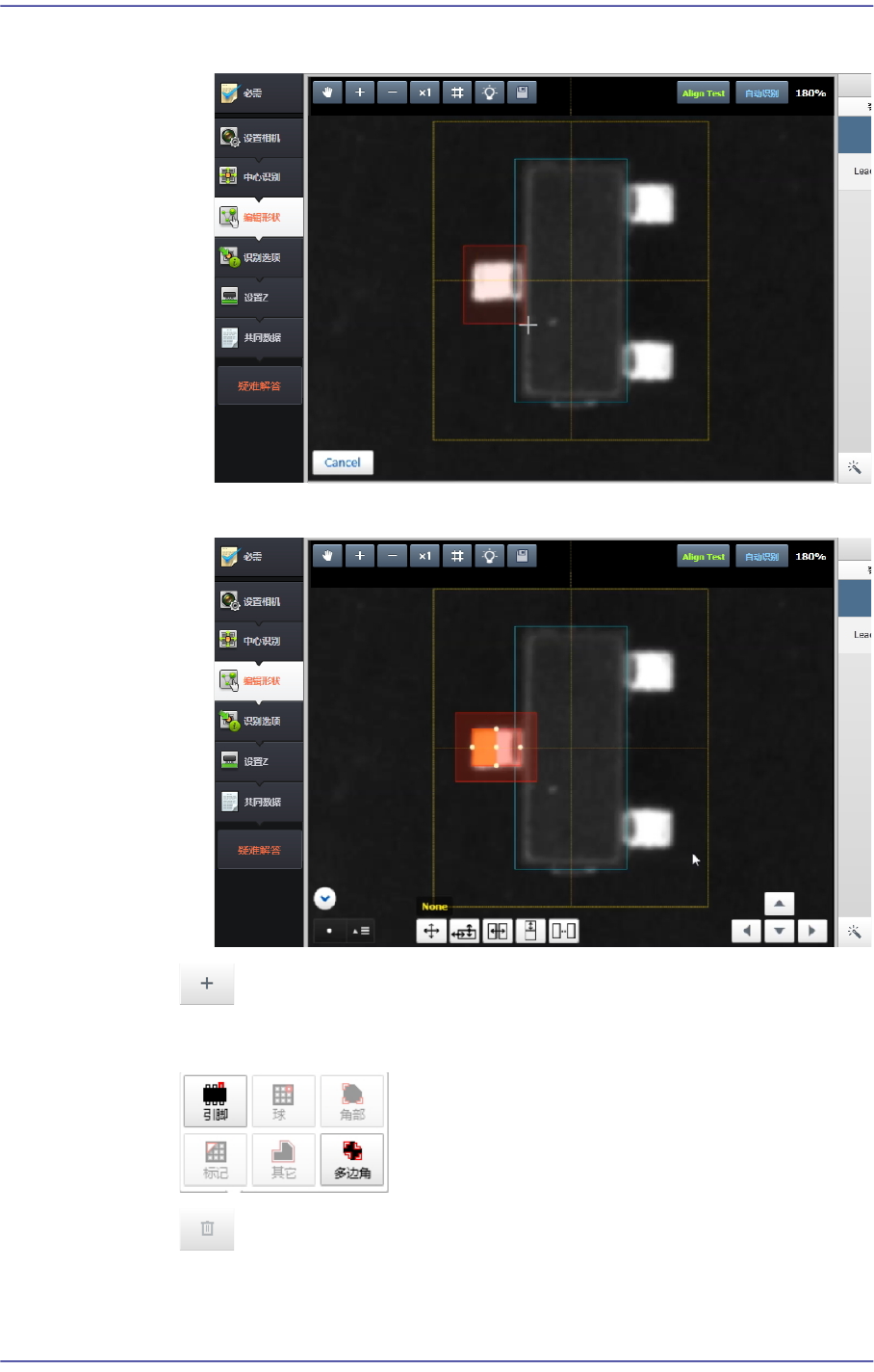 7-46 Fast Chip Shooter SM471 PLUS Admini st rator’s Guide 2) 利用鼠标拖曳方式选择需要局部识别的领域 3) 自动创建需要局部识别的形状实体后进行识别测试 按钮 以手动方式添加引脚、 球、 角部 、 标记、 其它形状实体。 按钮 删除在 < 客体列 表 > 群选择的实体。