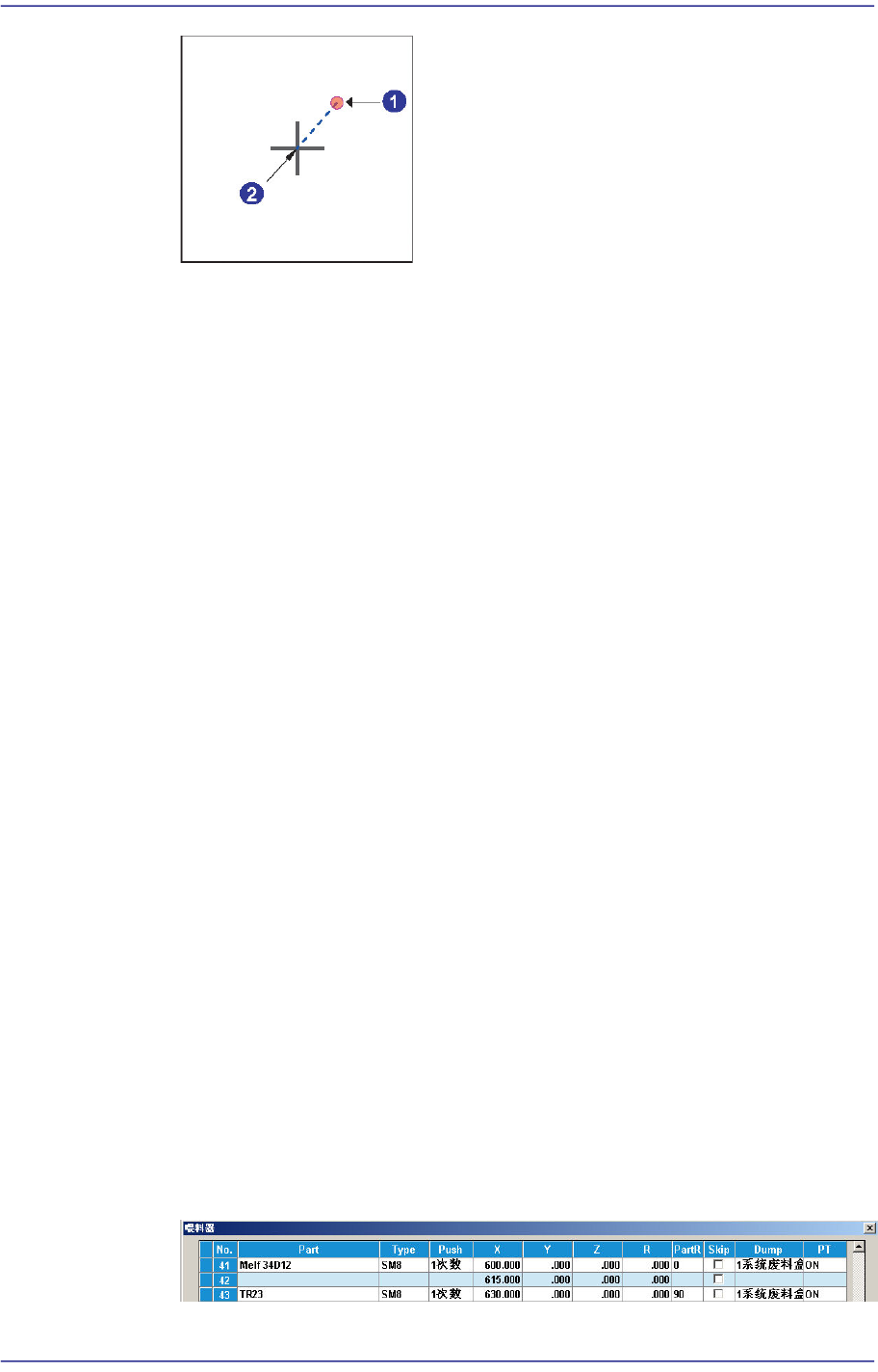 7-65 元件的登记 1: Head 中心 ( 实际吸取点 ) 2: 元件 Align Point 在这里容许误差是指从元件的 Align Point 到实际吸 取点 Head 中心的 Offset 。 < 吸取形式 > 选择框 请选择元件吸取方式。 Normal 以正常方式吸取元件时选择。 V i rtu al Pick 实际上不吸取元件地贴装时选择。 所有的元件贴装行为都利用元件的中心进行吸取及贴装。 但是如…