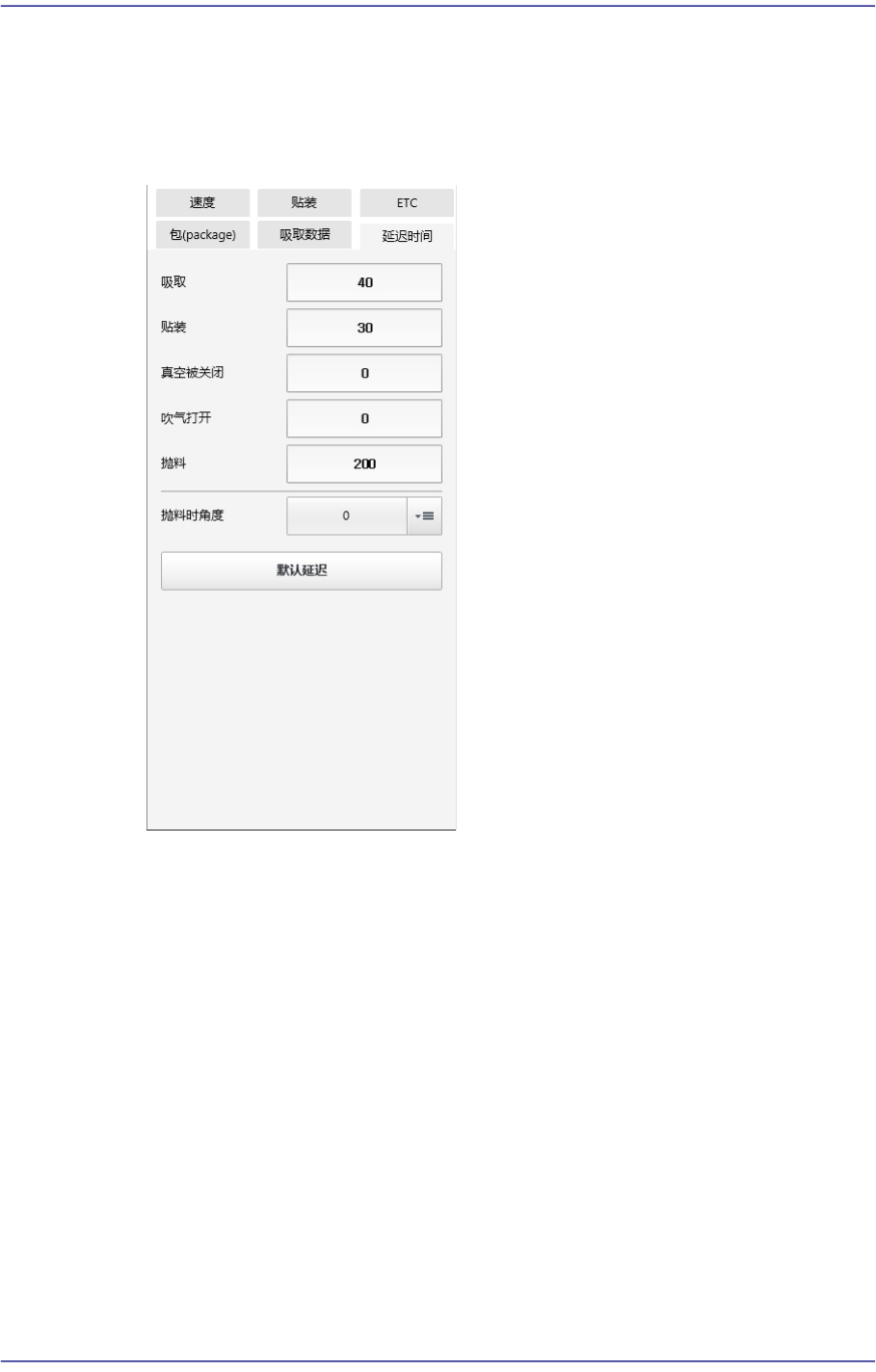 例如,设置成‘Place’ 50,‘真空关闭’ 10, ‘吹气打开’ 10,