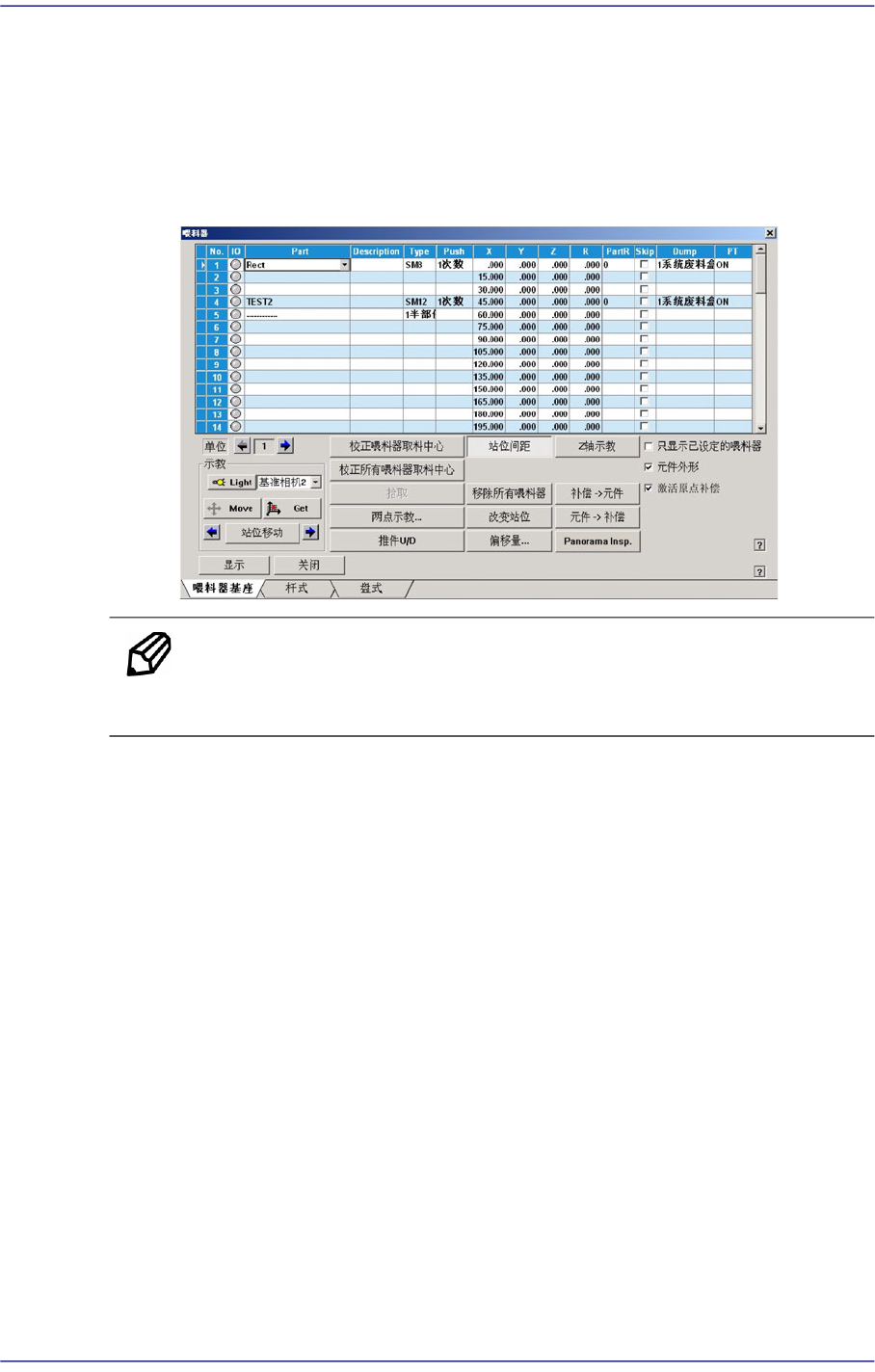指定装在各喂料器的部品,吸着部品位置的示教,吸着部品测试等操作。选择此功