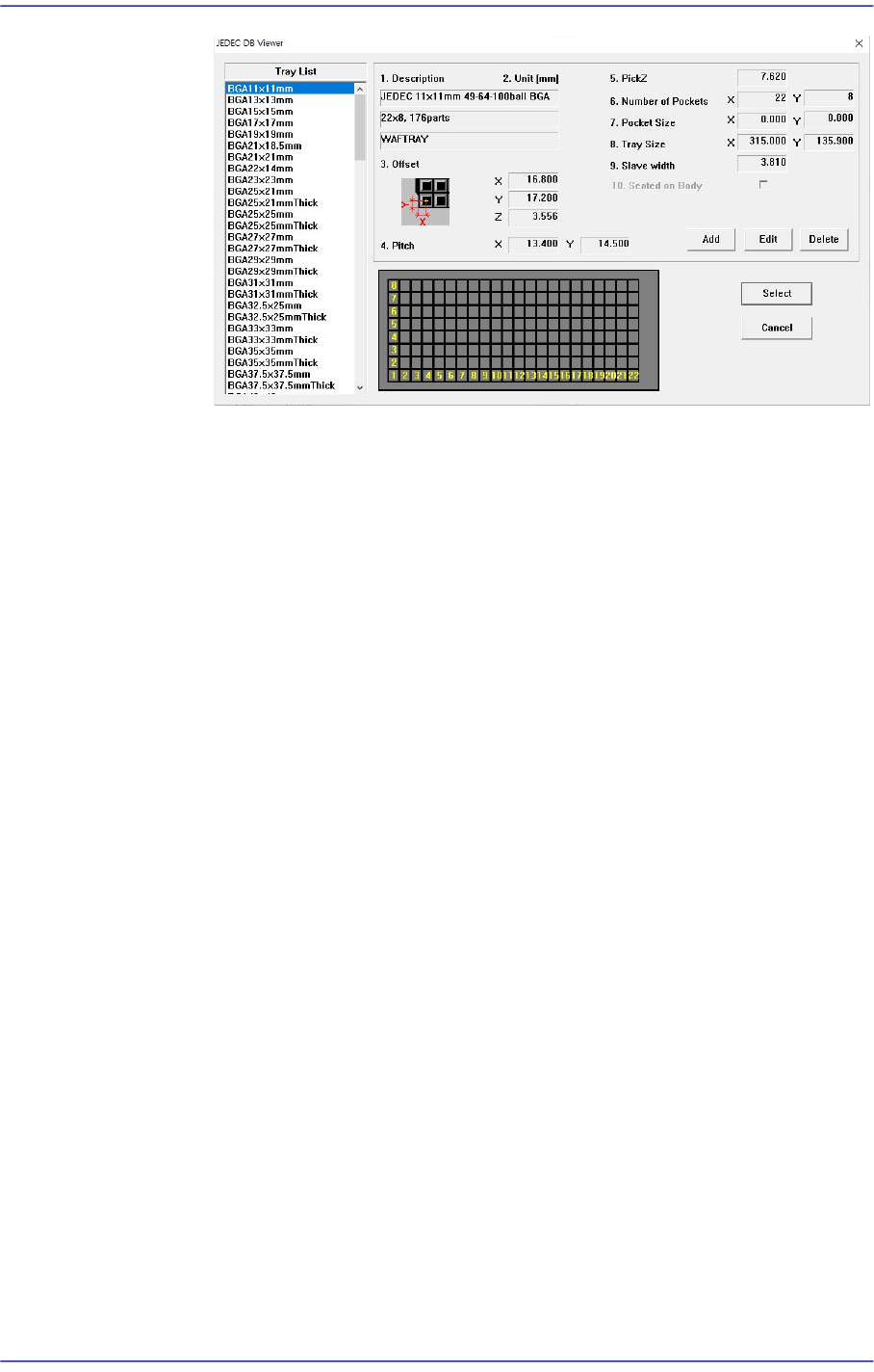 8-30 Fast Chip Shooter SM471 PLUS Admini st rator’s Guide < 描述 > 标题框 托盘的样式和大小。 <Of fse t> 标题框 它表示 X , Y , Z 的偏移值。 <Pitch> 标题框 托盘中零件中心之间的距离。 <PickZ> 标题框 拾取托盘提供的零件时, 设置 Z 轴的高度。 < 口袋数 &g…