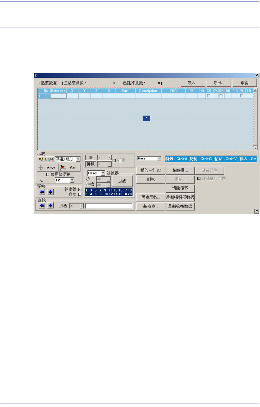 ‘贴装步骤’ 子菜单编辑有关PCB贴装点的位置,部品的基准点标记,要贴装的部