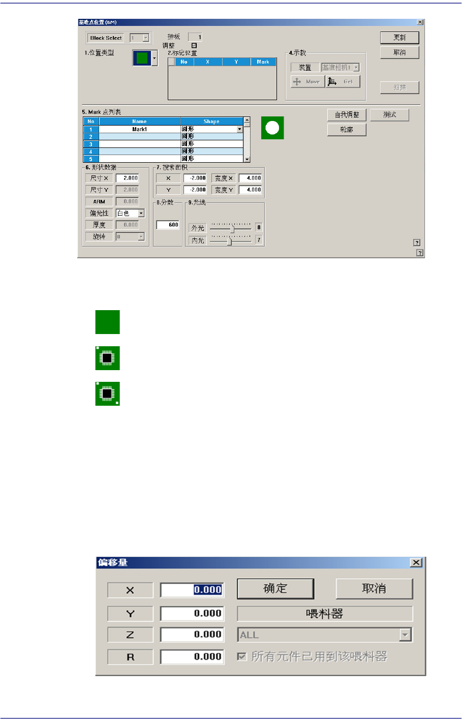 9-8 Fast Chip Shooter SM471 PLUS Admini st rator’s Guide 所有部件适用偏移值。 <X> 编辑框 设定 X 轴方向的偏移量。 <Y> 编辑框 设定 Y 轴方向的偏移量。 <Z> 编辑框 设定 Z 轴方向的偏移量。 <R> 编辑框 设定 R 轴方向 的偏移量。 < 确定 > 按钮 关闭对话框, 同时把已设定…