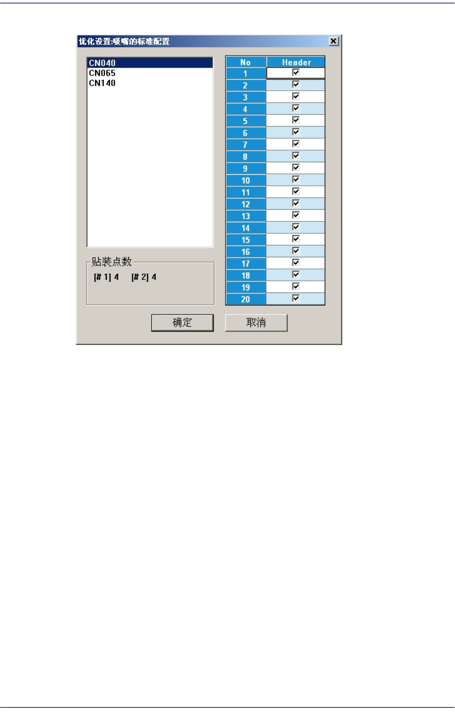 上图显示吸嘴CN040可以在头1和头20之间的任何头上作业。