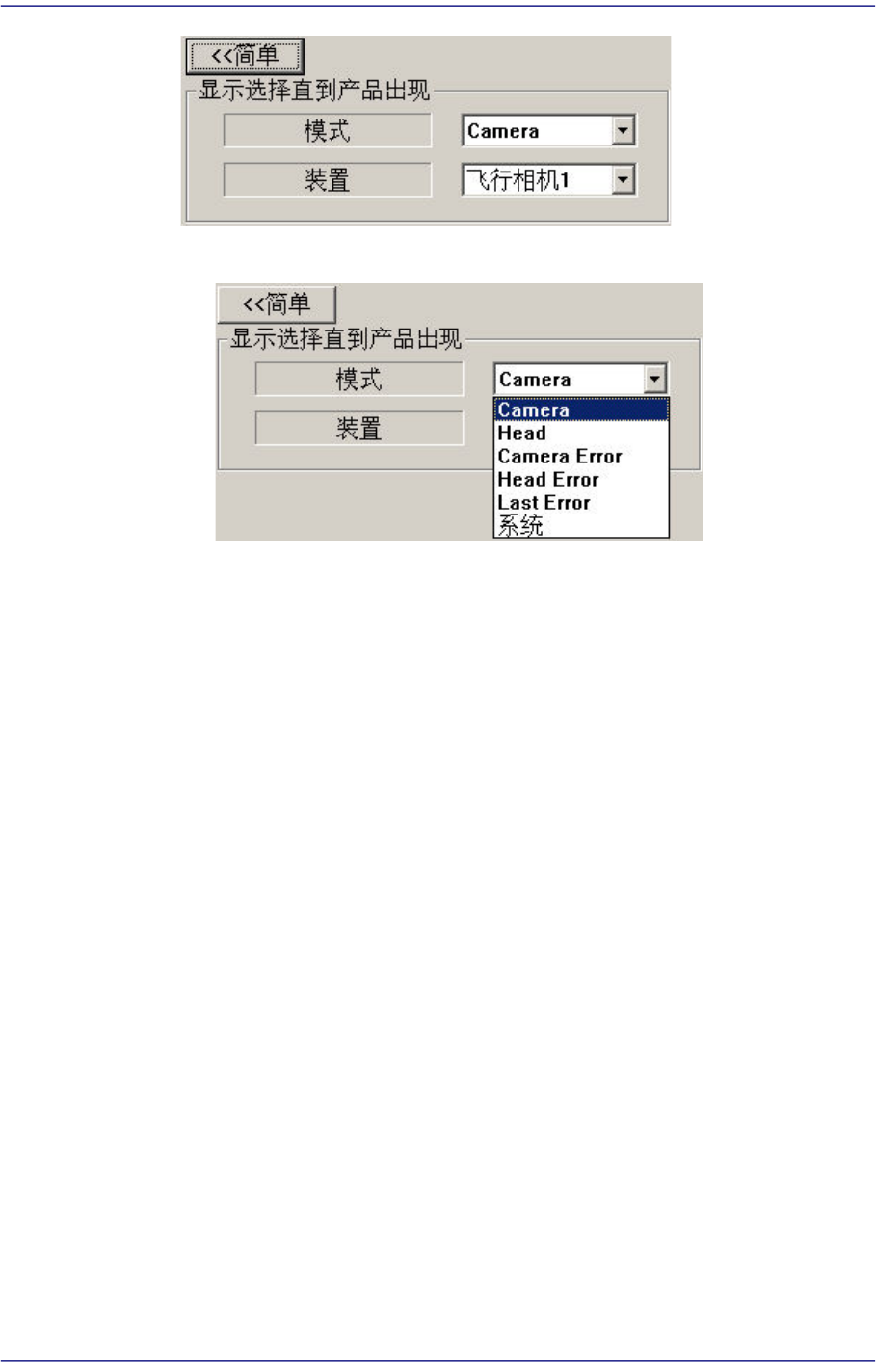 12-11 Production Setup < 模式 > 组合框 Camera 需要观看某种特定摄像机的影像时选择。 请在 <Device> 组合框中选 择相应的摄像机。 Head 要观看使用某特定 head 吸附的部 件 影像时选择。 请在 <Device> 组合 框中选择相应的 he ad 。 Camera Error 要观看在某特定摄像机发生的部件识别错误影像时选择。 作业中按…