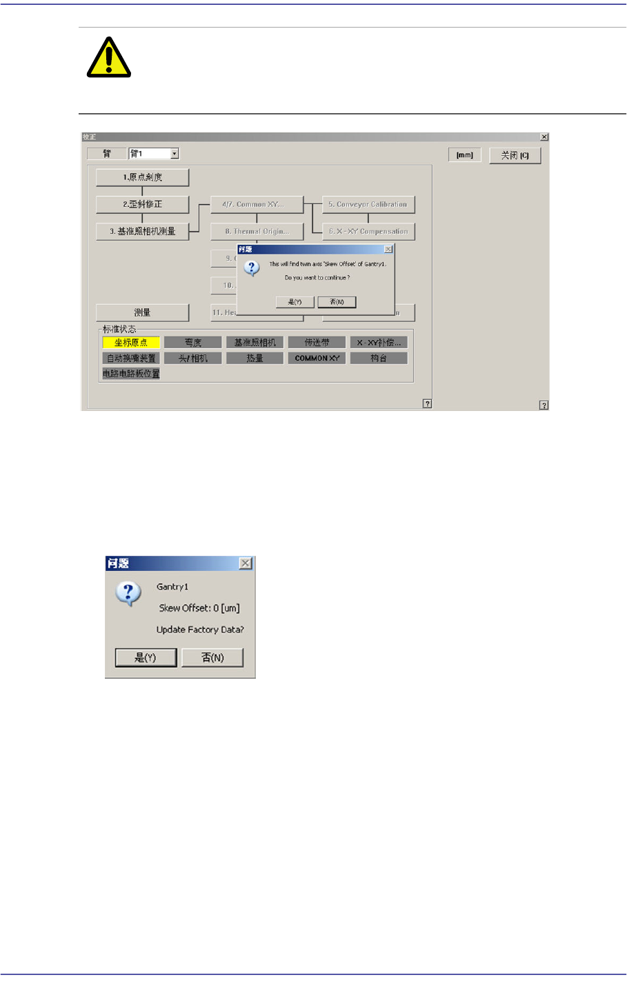 13-17 Machine Cal ibration 注 意 最初设备的安装及移动后, 执行初始化之前必须执行 < 螺母补偿 > 。 否则 设备驱动中可能会受到损伤。 首先, 把 X 机架手动移动到设备的中间部分。 请点击 < 歪斜修正 > 按钮。 那么自动对 Z 轴执 行初始化, Y 1 轴电 动机旋转, 到感知 Y Home 传感器为止移动 X 机架, Home 传感器感知后, 反方向移动相当于 Y …