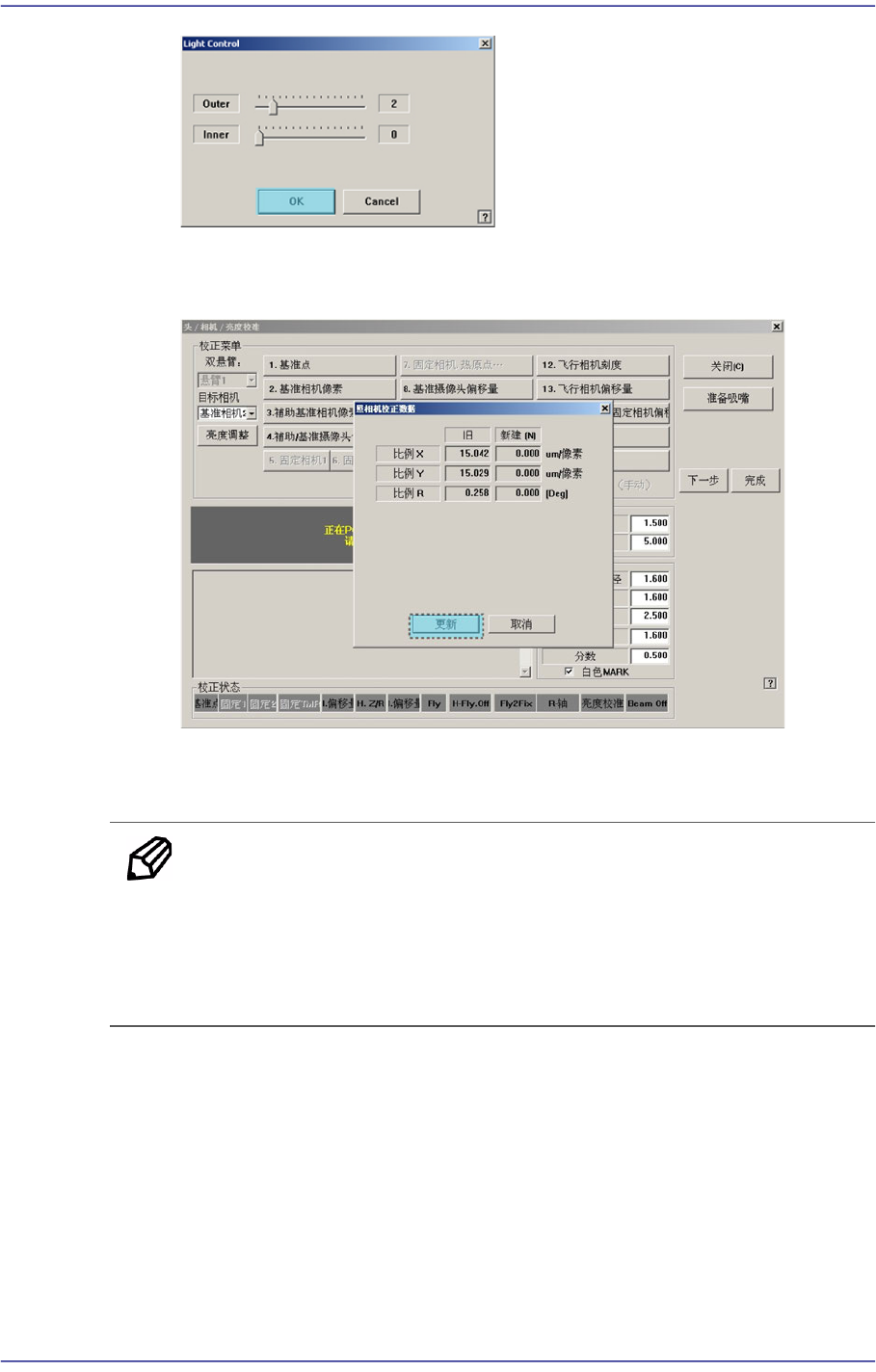 13-21 Machine Cal ibration 4. 自动执行 Cal i bration 后, 结束校正则如下图显示结果值。 要适用新的校正值 请点击 < 更新 > 按钮。 5. 每个悬臂使用 2 个基准相机时, 单击 <3. Other Fid. Camera Scale> 键后按照 同一方法实行校准 ( Calibra t ion) 。 备 注 基准照相机测量 (FOV 7.5) 的校正基准值如下。 …