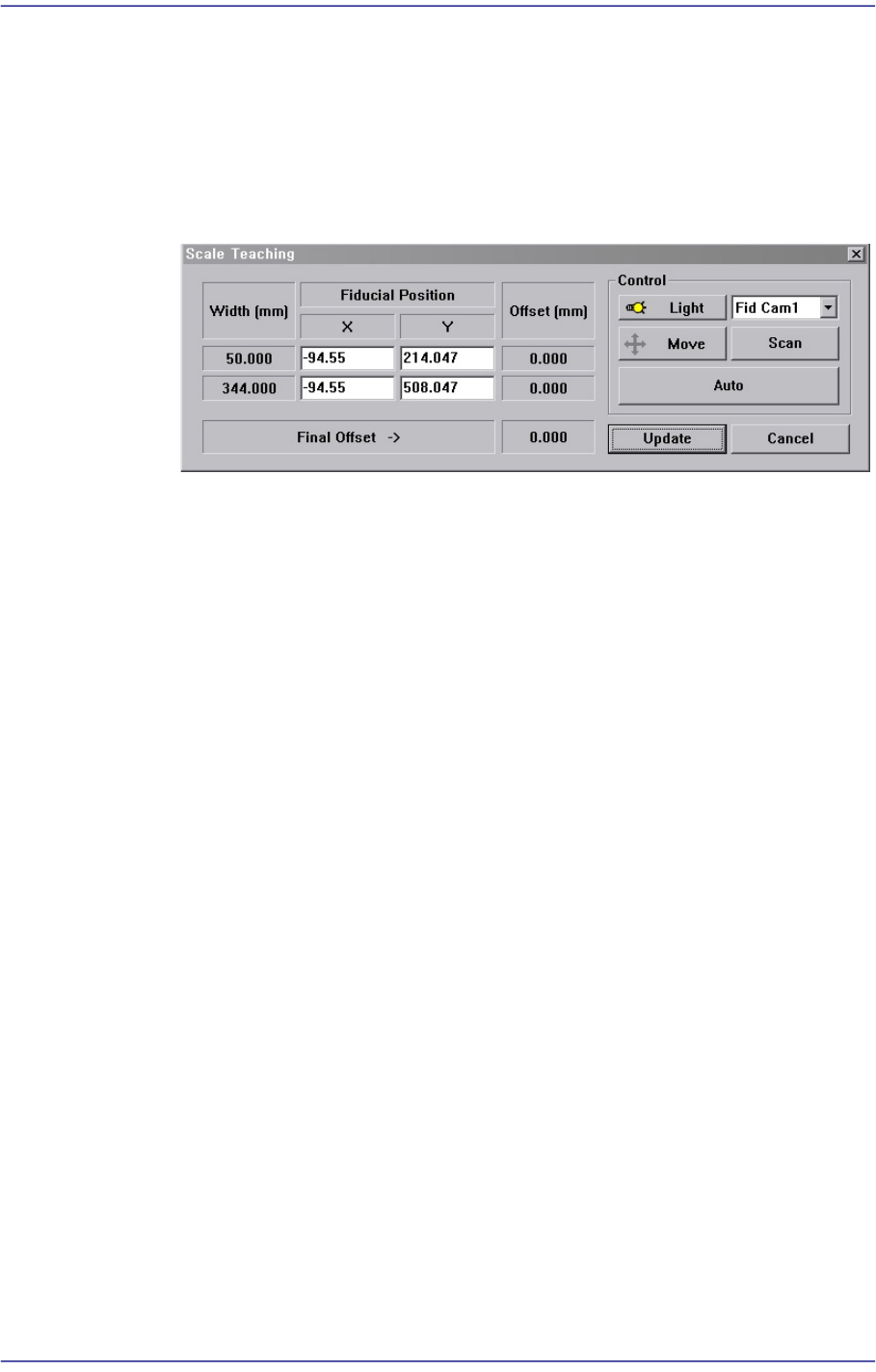 扫描 <Fiducial Position> 所选择的输送机的基准标记后,在 <Offset