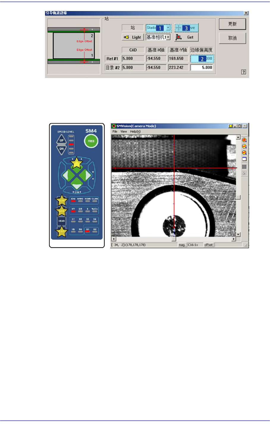 点击’AXIS’按扭选择XY,使Vision上的十字线和Transport Rail Frame一致,再