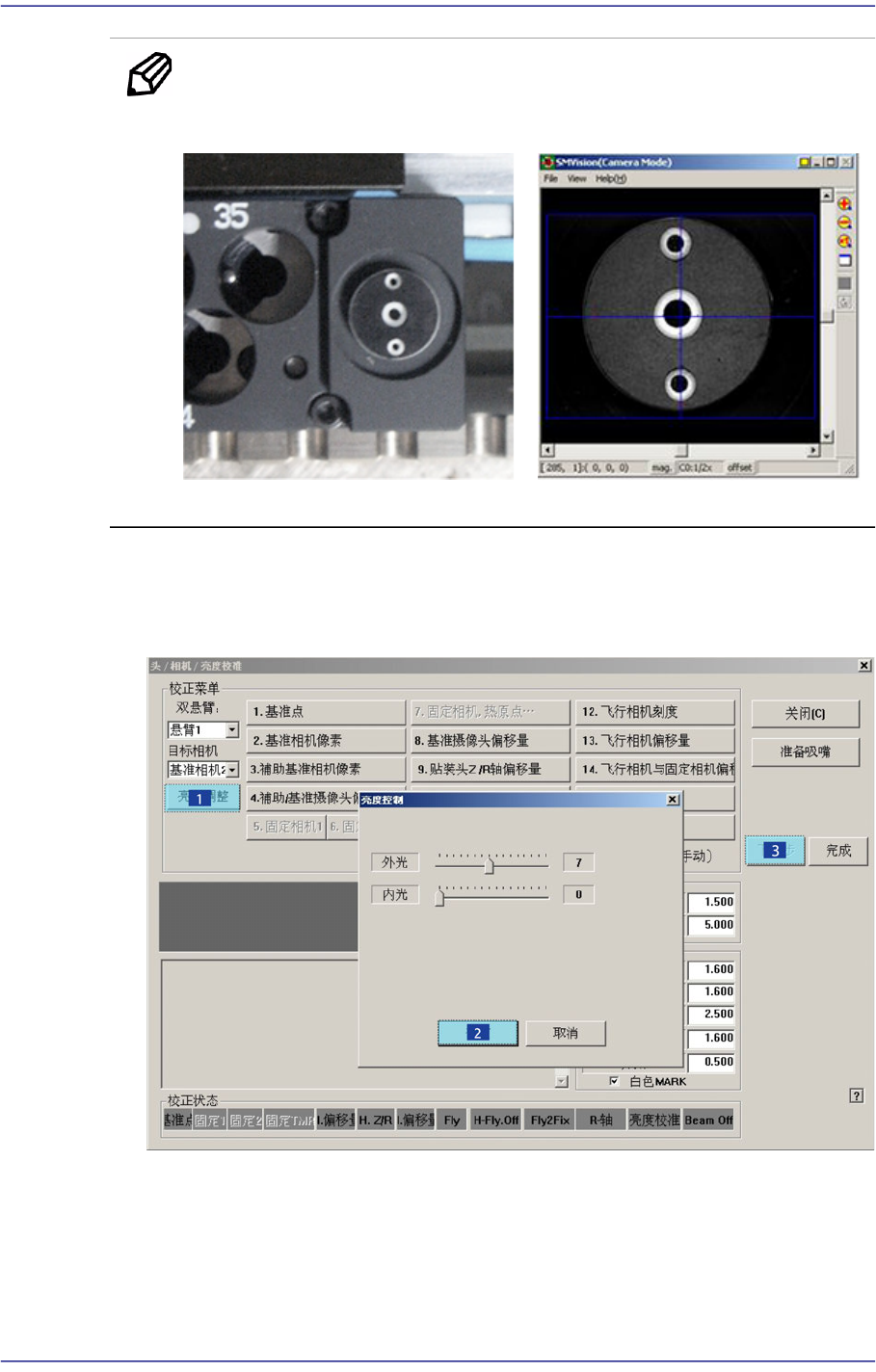 13-45 Machine Cal ibration 备 注 参考下列图请把校正 T o ol 正确放置到 ANC 的校正 T ool 处。 5. 消息窗显示 “ 准备标准。 对于标准, 点击 [ 下一步 ]” 消息。 此时 , 点击 < 亮度 > 按 钮后在 “ 亮度控制 ” 对话框中使 ’SMV ision’ 窗口显示的 Calibration T ool 上的 Fiducial Mark 明显, 调 整照明亮度后点击 …