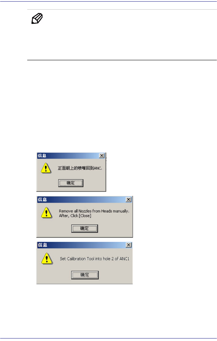 出吸嘴。”消息。为了在磁头1号的吸嘴支架上手动除去Calibration Tool请点击 <
