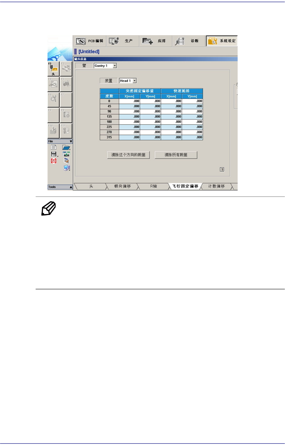 13-68 Fast Chip Shooter SM471 PLUS Admini st rator’s Guide 1 1. 完 成对 Gantry1 的校正后 在 <Gantry> 组合框中选择 ’Gantry2’ 以相同的方法执行 校正。 结果值可在 Fly-Fix Offset 对话 框中确认。 备 注 Fly to Fix Offse t 的校正基准值如下。 Of fset X : -0 .050 ~ 0.05…