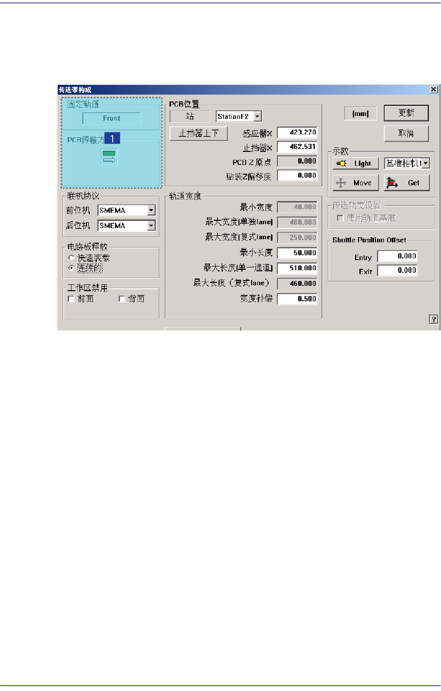 域记入该值,再点击 <传送轨道宽度> 按钮把输送机的宽度配合输入的