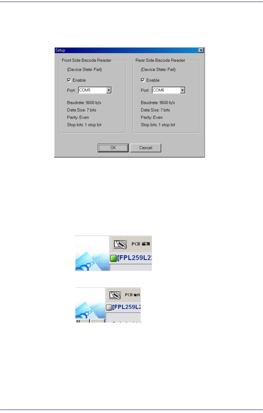 14-34 Fast Chip Shooter SM471 PLUS Admini st rator’s Guide 针对 MES 主机 (Host) 识别 本设备时的 ID 进行设定。 <Configure BCR...> 按钮 单击该键时, 将出现下列条形码扫描器设置用对话窗口。 <Enable> 选择框 需要使用条形码读取机时, 请圈选该复选框。 <P ort> 组合框 针对设备与条…
