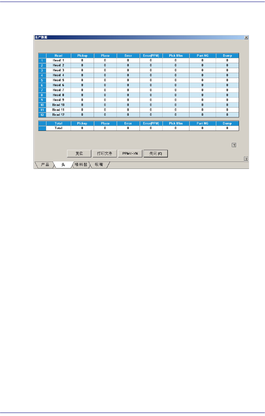 表示各磁头的作业信息,显示跟贴装有关的全部统计信息。