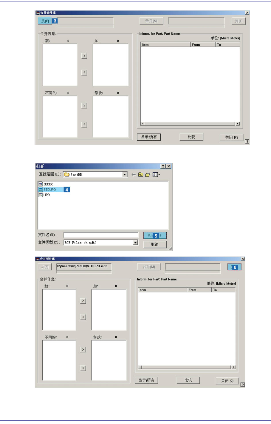 <在〈新:〉目录框或〈不同的:〉目录框选择要合并到Target DB文件的部件信息