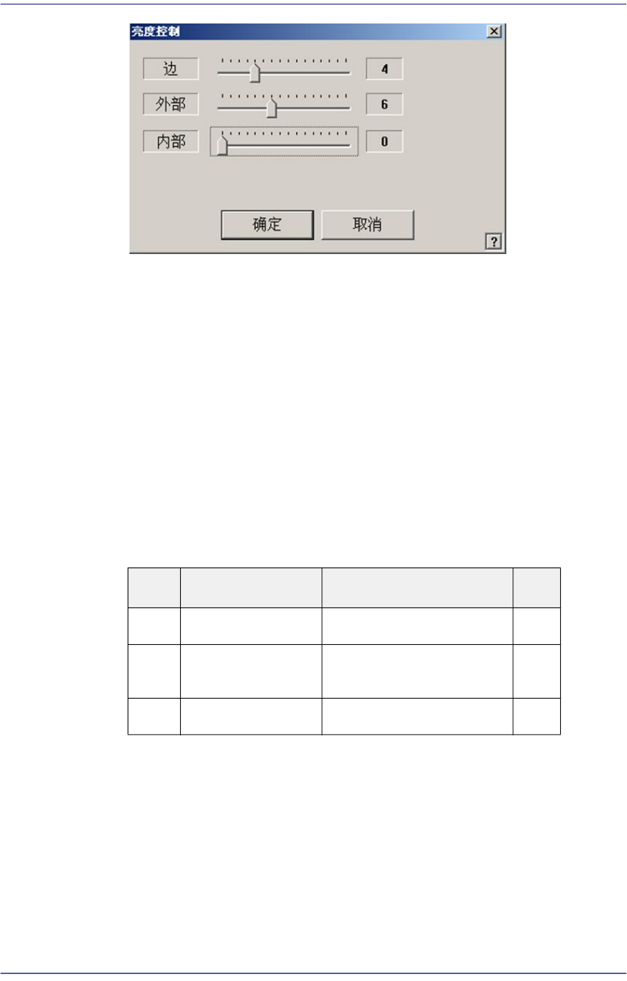 4-9 Tools 简化操作 (shortcut) 菜单 < 边 > slide bar 设定侧面的照明度。 (0 - 15) < 外部 > slide bar 设定外部照明度。 (0 - 15) < 内部 > slide bar 固定相机时 , 设定内部 照 明 度。 (0 - 15) < 确定 > 按钮 把设定的照明度反映到照明数据后关闭对话框。 < 取消 &…