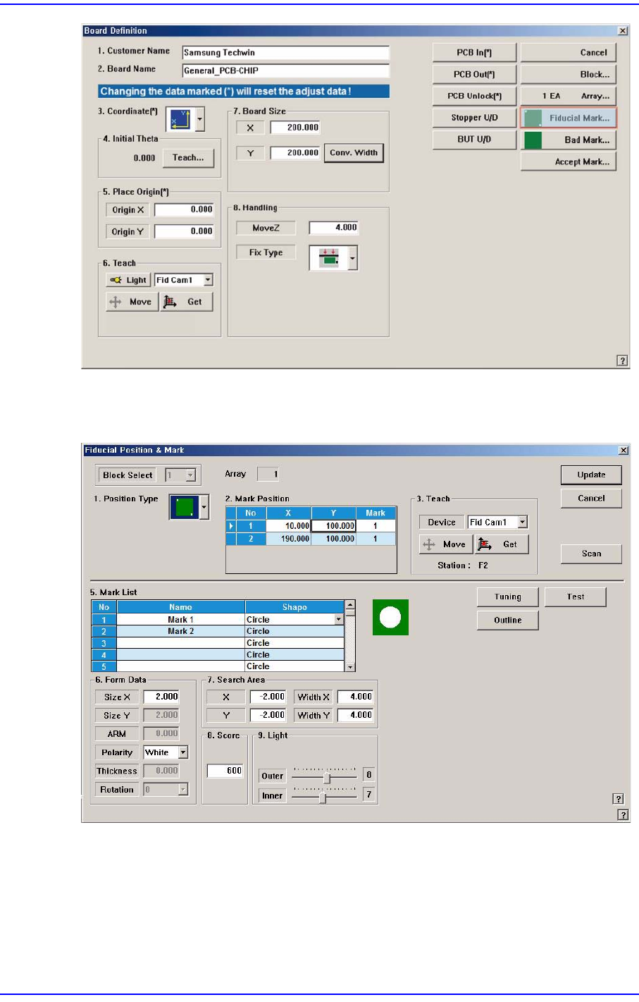6-18 Samsung Component Placer SM 411F/411FN Administrator ’ s Guide 설정할 모델을 선택한 후 , 다른 항 목들을 설정하십시오 . <1. Position T ype> 콤보박스 Fiducial Mark 는 1 점 , 2 점 , 3 점을 선택하여 사용 할 수 있습니다 . 1 점을 선택하 는 경우라면 , PCB 의 X,Y 의 틀어짐…