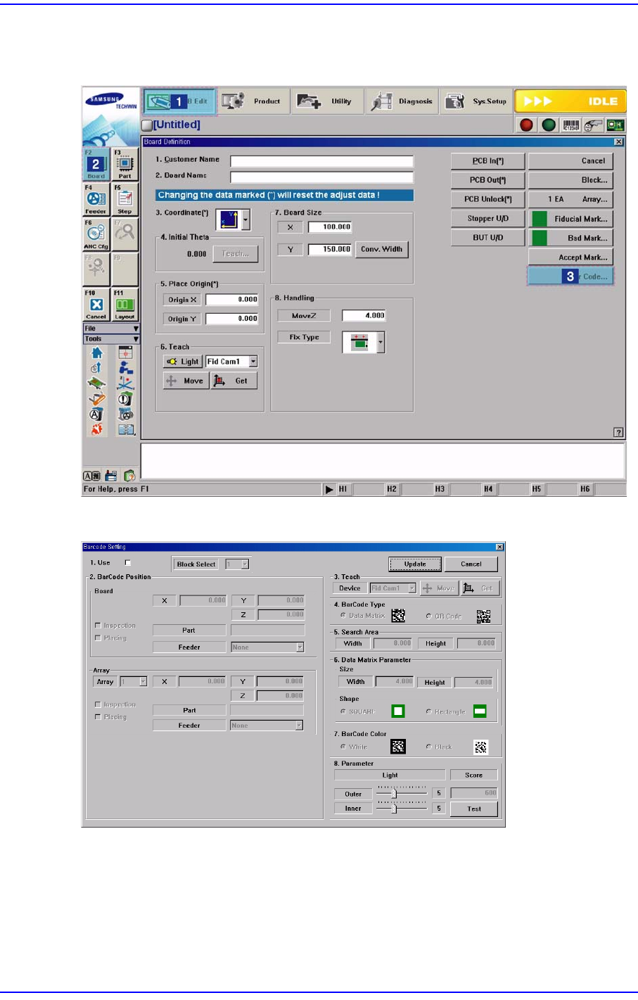 드 위치를 티칭하거나, 보드에 2D 바코드를 부착하기 위한 설정을 합니다.
