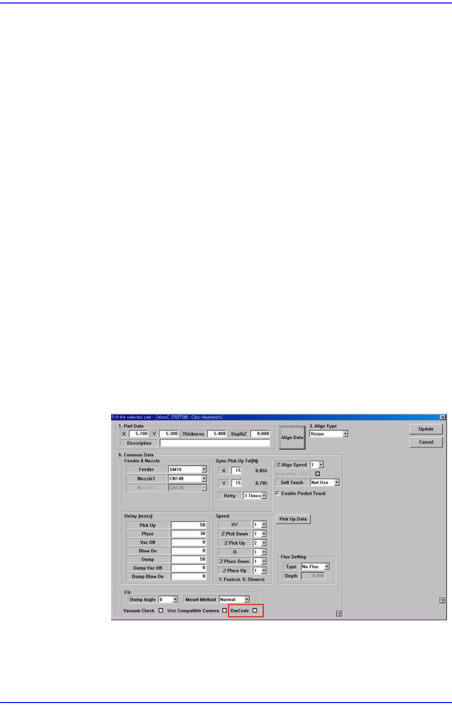 6-37 Board 정의 6.6.2. Barc ode Position 그림 6.9 “바코드 위치’ ’ 대화상자를 실행하는 순서 그림 6.10 “바코드 위치’ ’ 대화상자 <1.Use> 체크 박스 2D 바코드 기능의 사용 여부를 선택 , 체크 시 2D 바코드 기능을 사용합니다 . <2. Bar Code Position> 영역 2D 바코드를 보드에 부착하거나 , 부착…