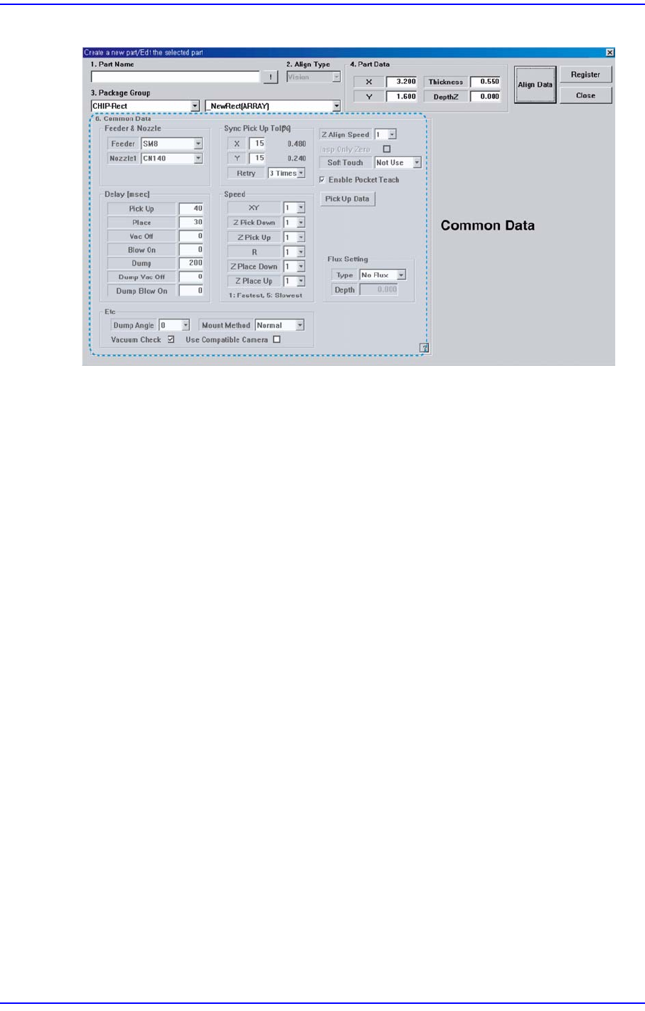 7-9 부품 등록 그림 7.4 “ Create a new part/Edi t the selected part- Common Data ” 대화상자 <Feeder & Nozzle> 영역 <Feeder> 콤 보박스 부품을 공급할 Feeder T ype 을 선 택합니다 . 선택 가능한 Feeder T ype 은 다음과 같 습니다 . SM8L: 8mm SM T ap…