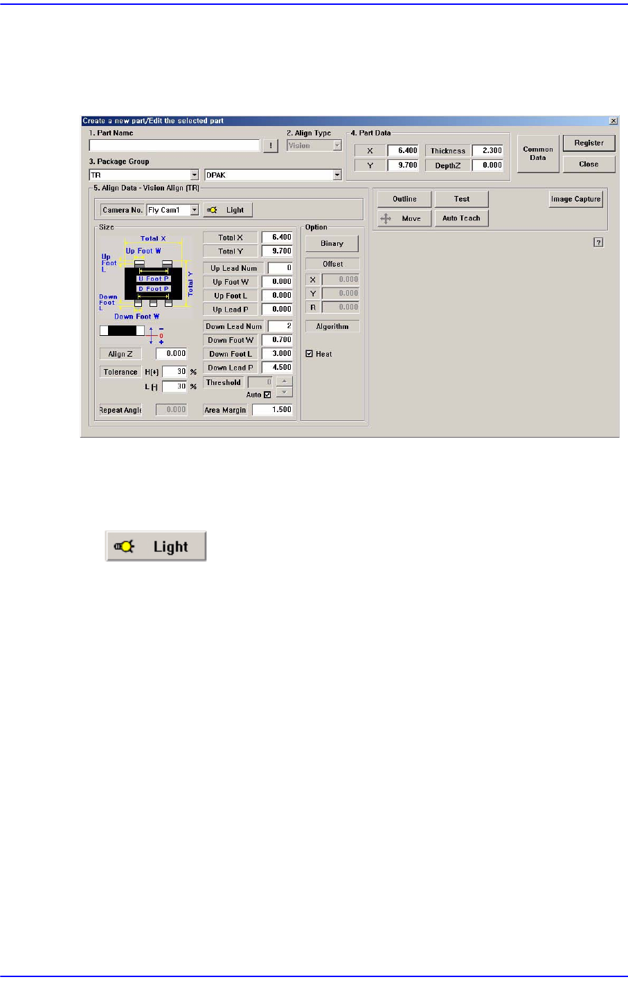 7-44 Samsung Component Placer SM 411F/411FN Administrator ’ s Guide 7.1.2.4. TR 부품데이터 설정 TR 부품에 관한 Align 데이터를 설정합니다 . 그림 7.16 “ Package Group = TR ”인 경우의 대화상자 <Camera No.> 콤보박스 부품을 인식할 Camera 를 선택합니다 . 자세한 사항은 “ …