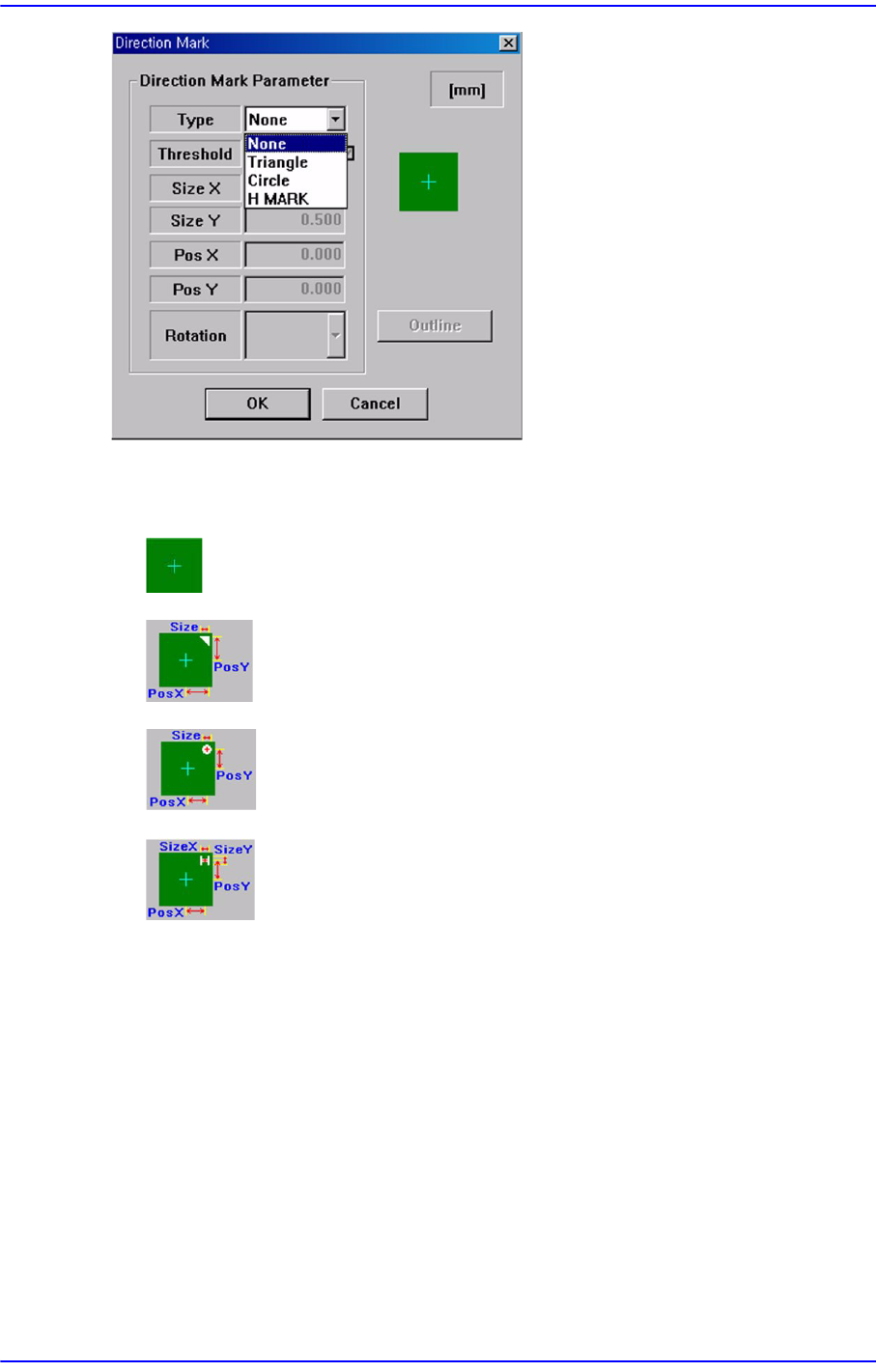 7-58 Samsung Component Placer SM 411F/411FN Administrator ’ s Guide <Direction Mark Parameter> 영역 <T ype> 콤보박스 None: Direction Mark 가 없습니 다 . T riagle: Direction Mark 가 T riangle 일 때 선택합니다 . Circle: Direc…