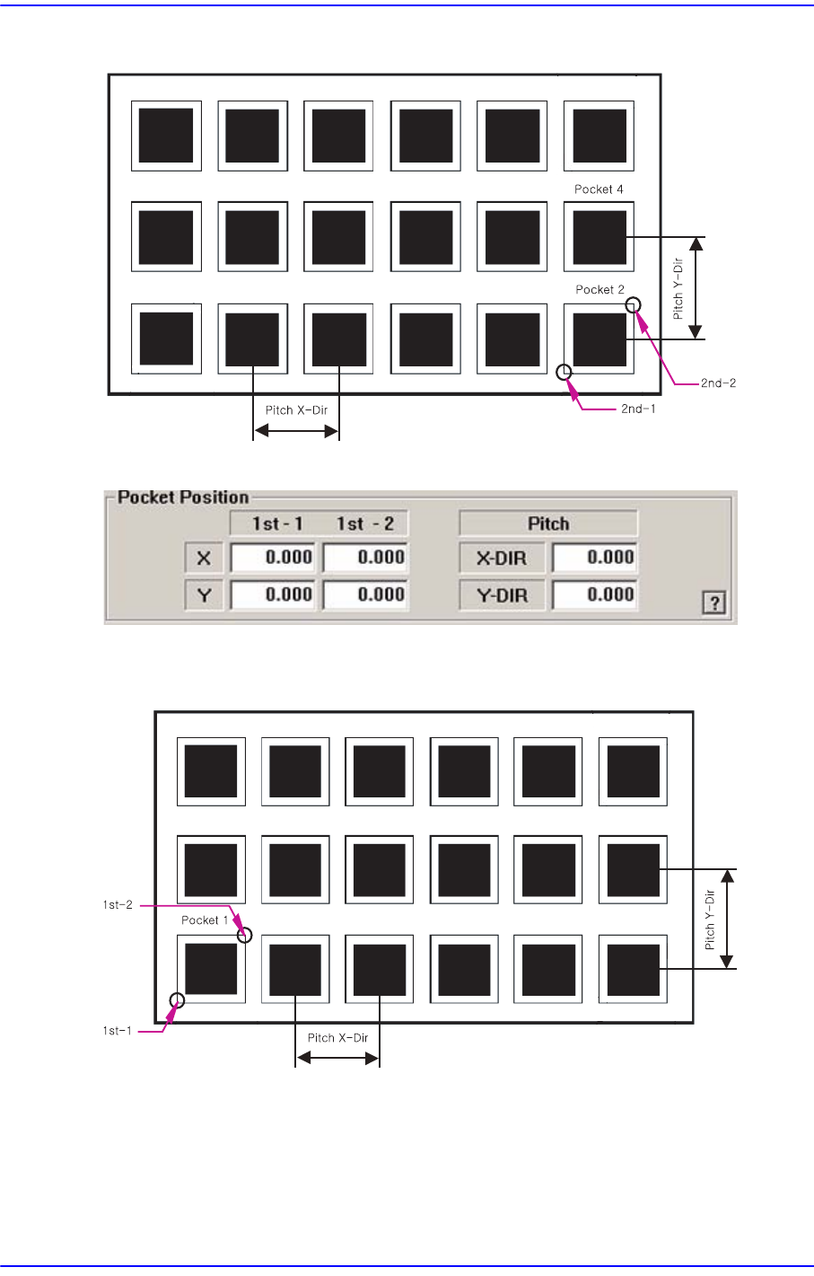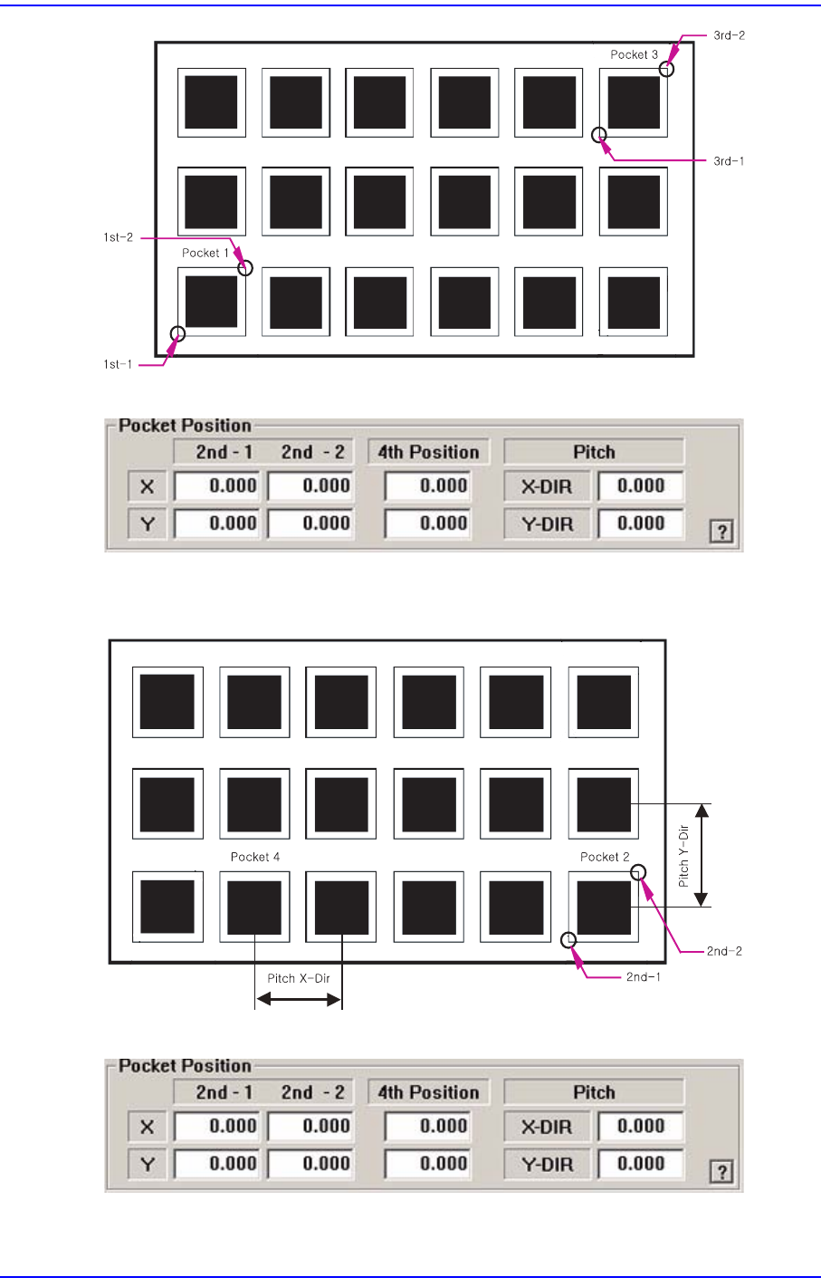 아래 그림과 같이 1번 Pocket의 대각선 꼭지점 좌표와 X, Y 방향 Pitch를 입력합