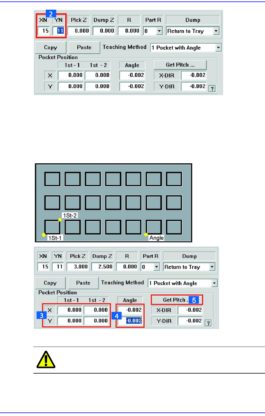 첫 번째 포켓과 피치 티칭용 포켓 간의 간격 수 NX, NY를 입력하십시오 .