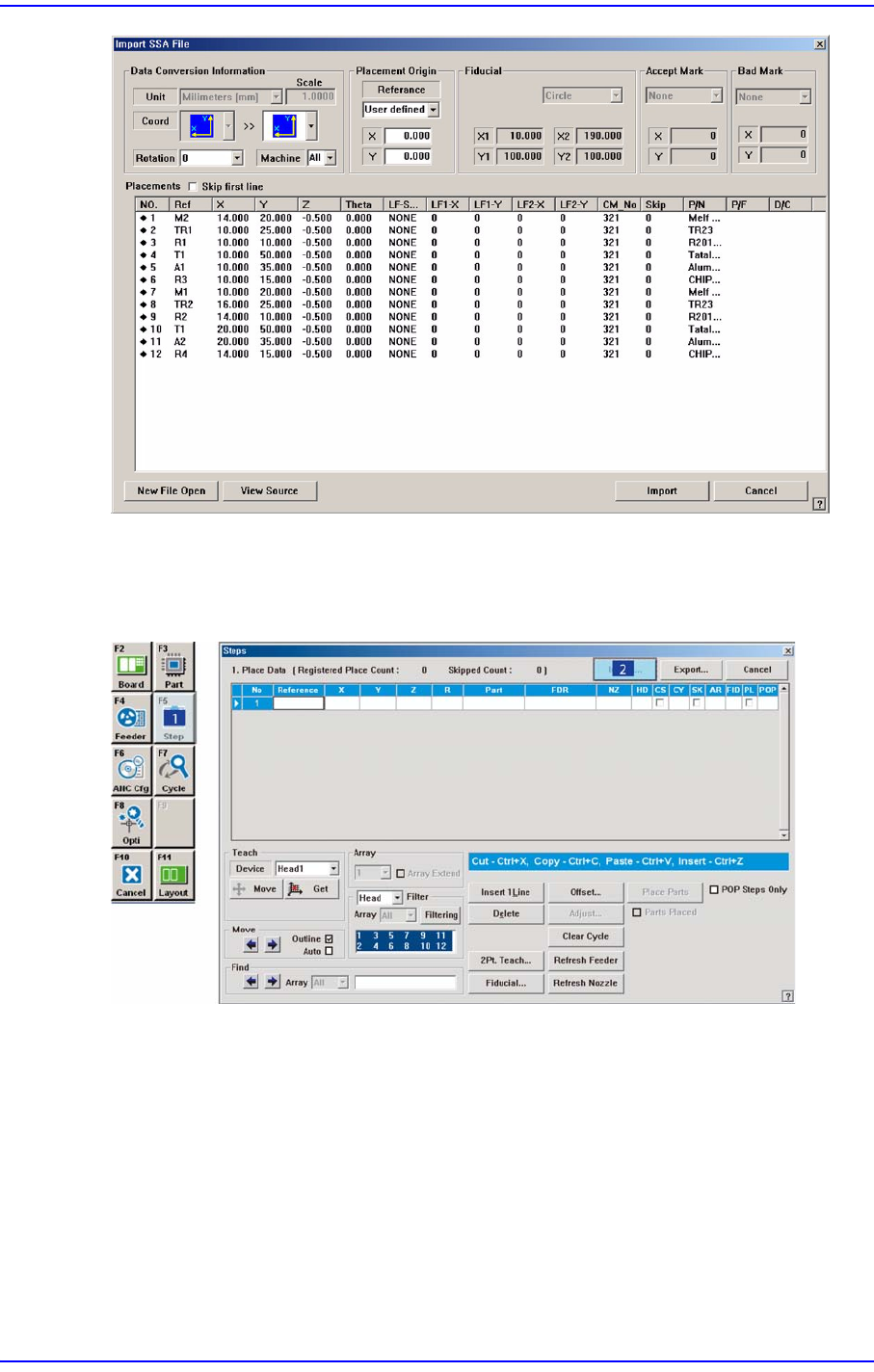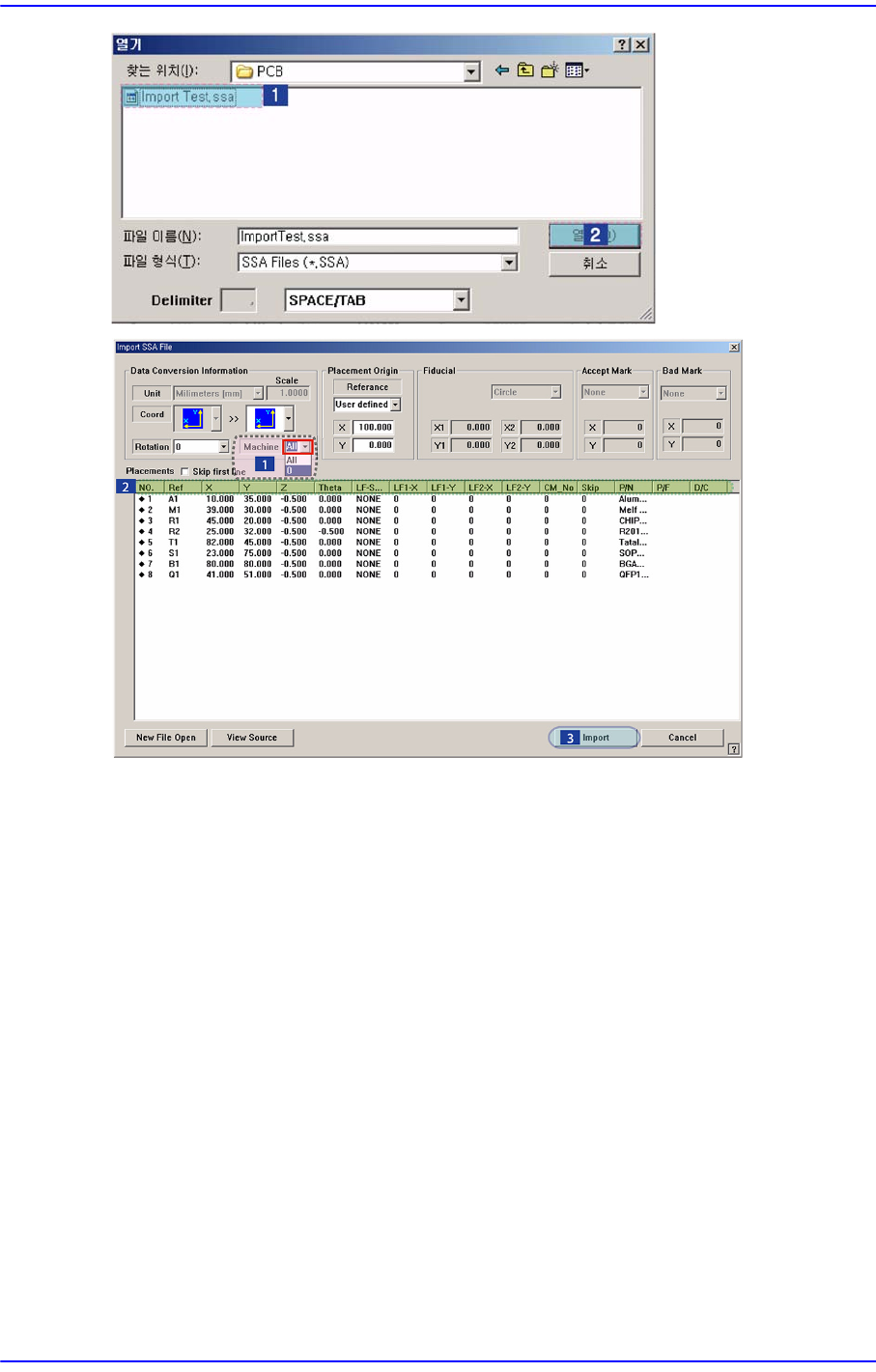 9-10 Samsung Component Placer SM 411F/411FN Administrator ’ s Guide Import 되어진 SSA 파일을 이용해서 작업을 할 장비를 선택하십시오 . 불러 올 장비 (Imported Machine) 를 선택하십시오 . 그리고 Placements 의 해당 열 (Row) 의 이름이 맞는지 확인하십 시오 . 당사의 기준형식 (SSA Format)…