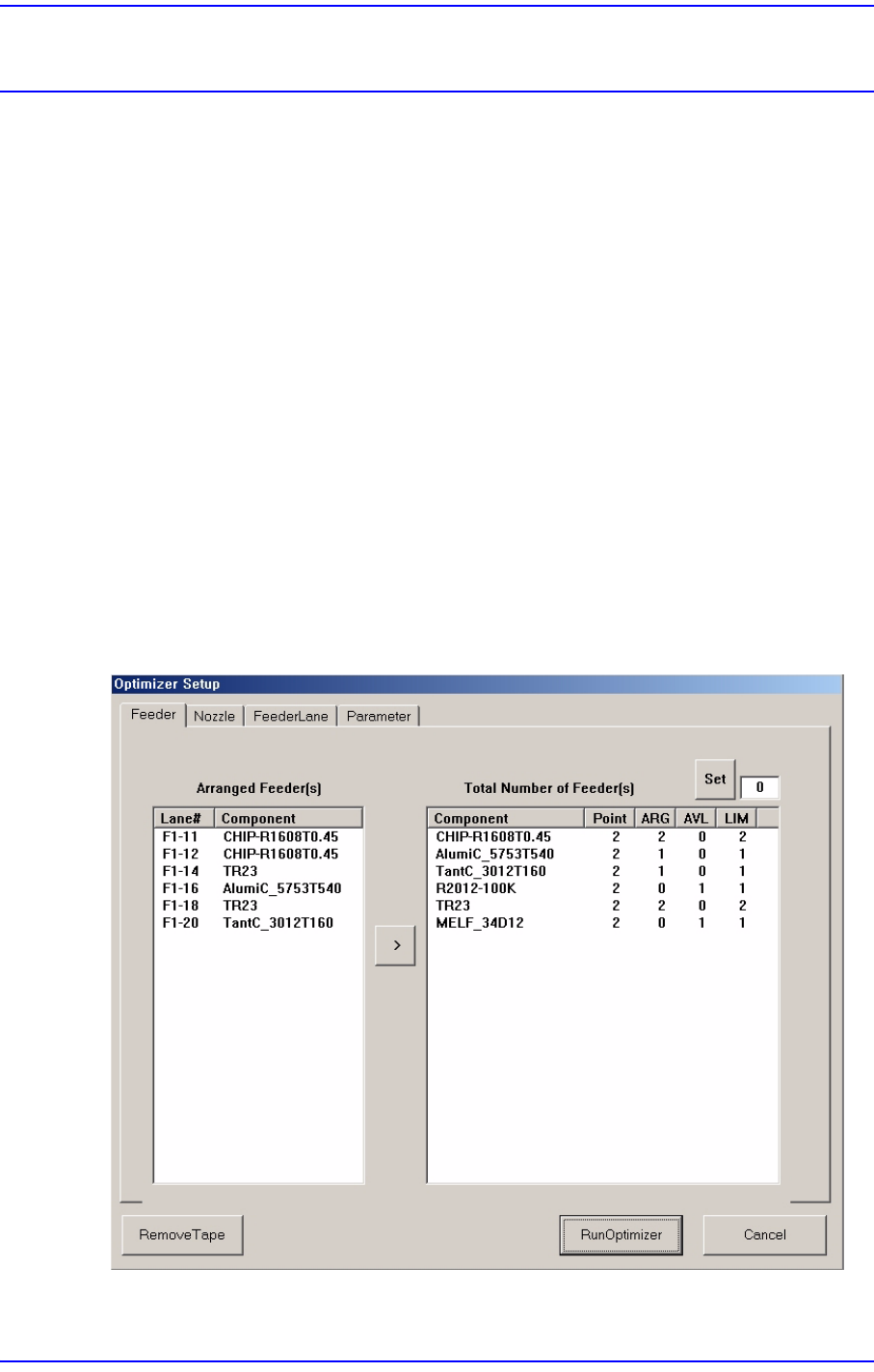 테이프 피더의 최적 배치에 대해 설정하는 화면입니다. 테이프 피더는 Optimizer에