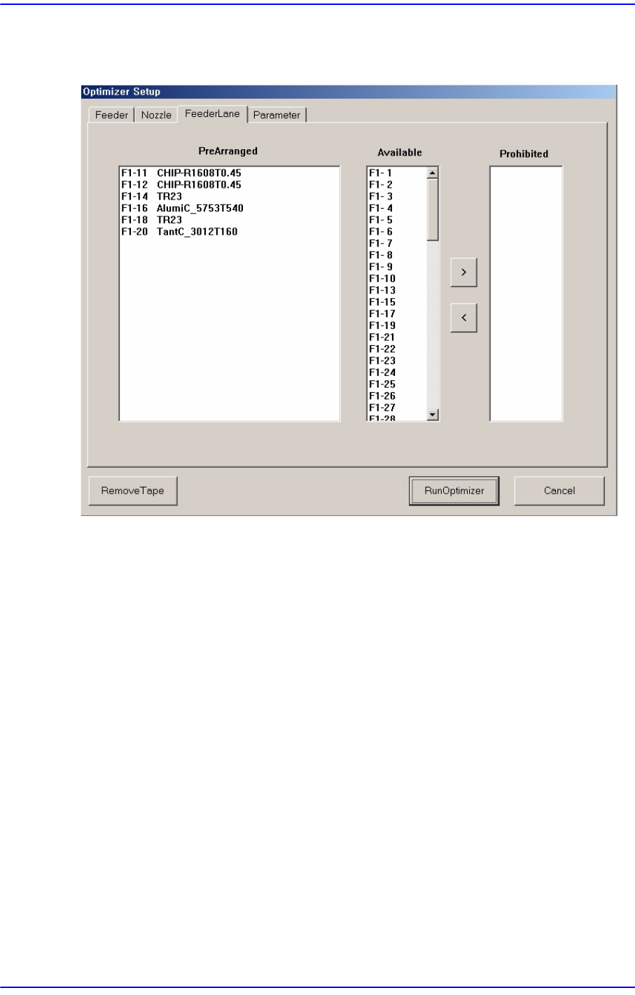 10-7 Optimization 특정한 피더레인에 아무런 장치를 배치하지 않기를 원하는 레인은 화살표 버튼 () 를 클릭하여 <Prohibited> 리스트박 스 영역에 나타나게 지정하십시오 . 여기에 표시된 레인에는 Optimizer 에서 어떠한 장치도 배치하지 않습니다 . () 을 클릭해서 되돌릴 수 있습니다 . Optimizer 에서는 피더레인에 배치되어 있거나 새롭게 배치될 …