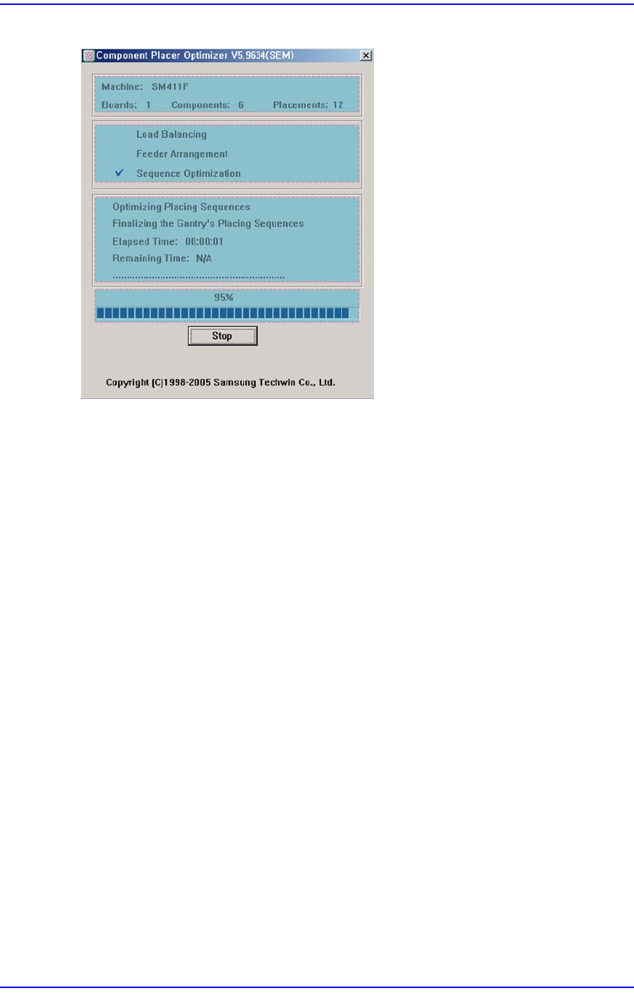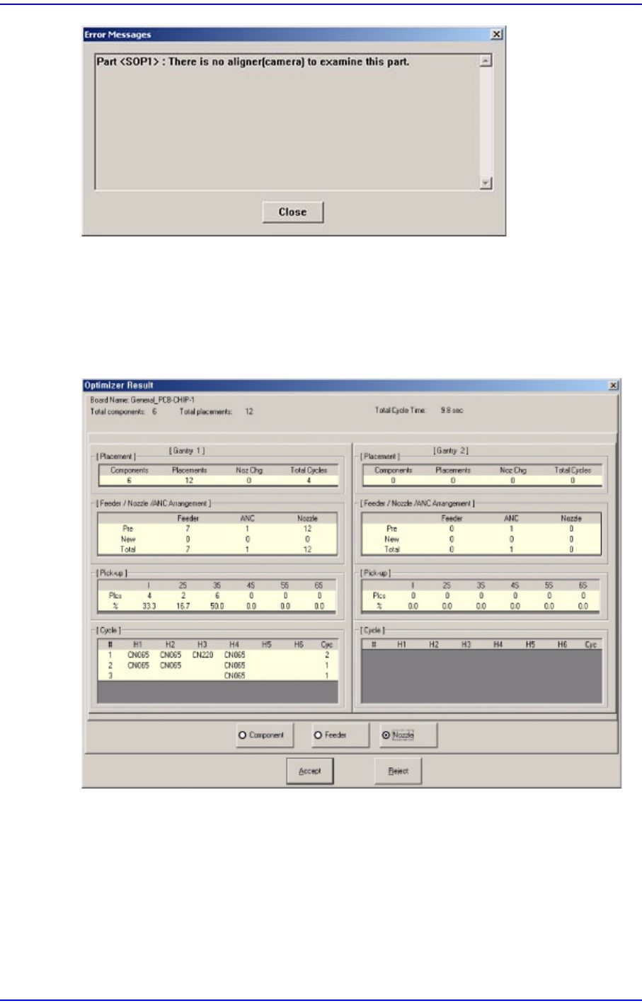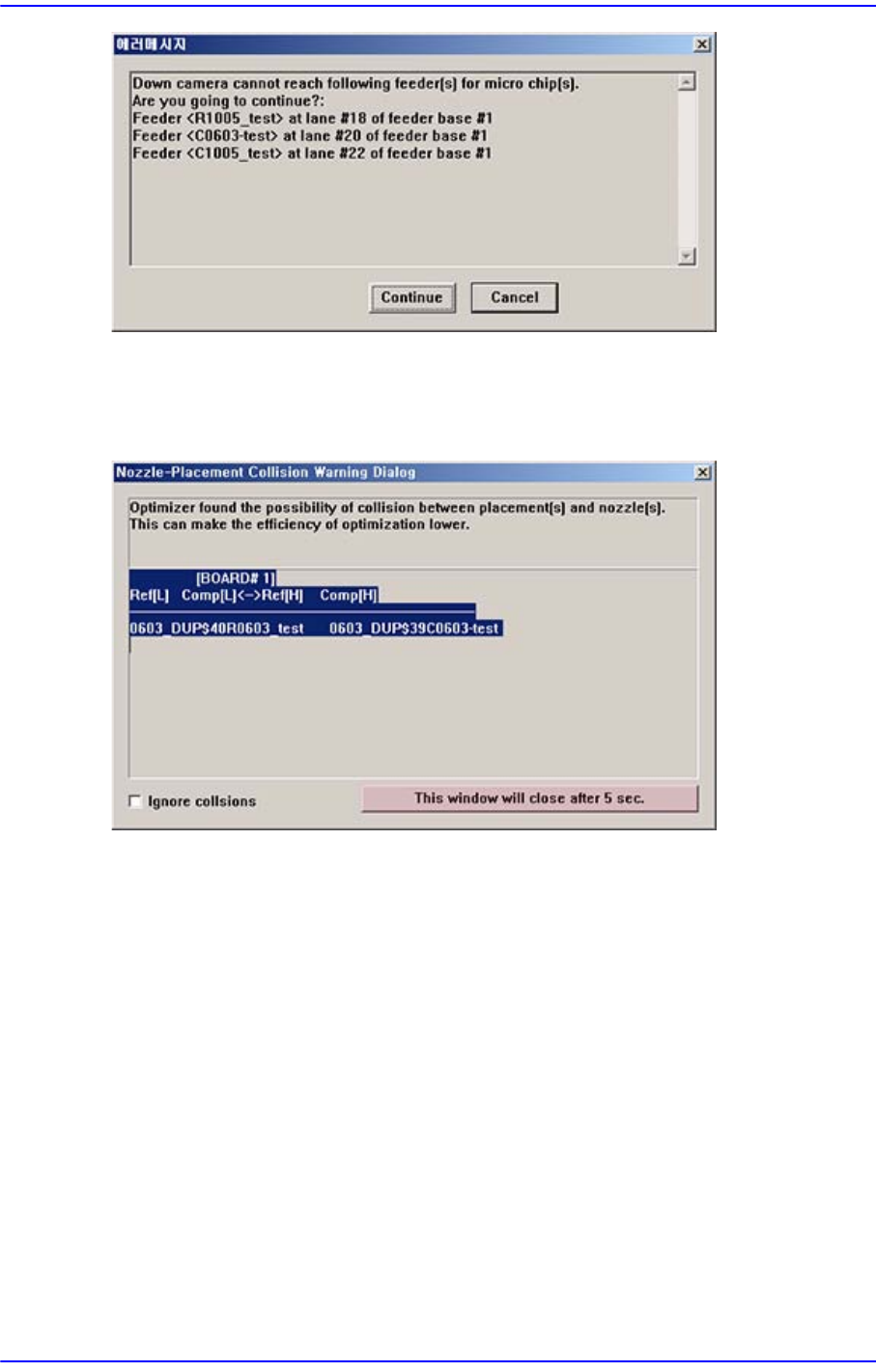 10-12 Samsung Component Placer SM 411F/411FN Administrator ’ s Guide 메시지 유형 2 사용자에 정보를 제공하지만 , 사용자의 입력에 상관없이 일정시간이 지난 후에 Optimizer 의 실행을 계속하게 됩니다 . <Ingnore collsions> 체크박스 체크박스를 선택할 경우 , 부품 장착시 이미 장착된 다른 부품과 노…