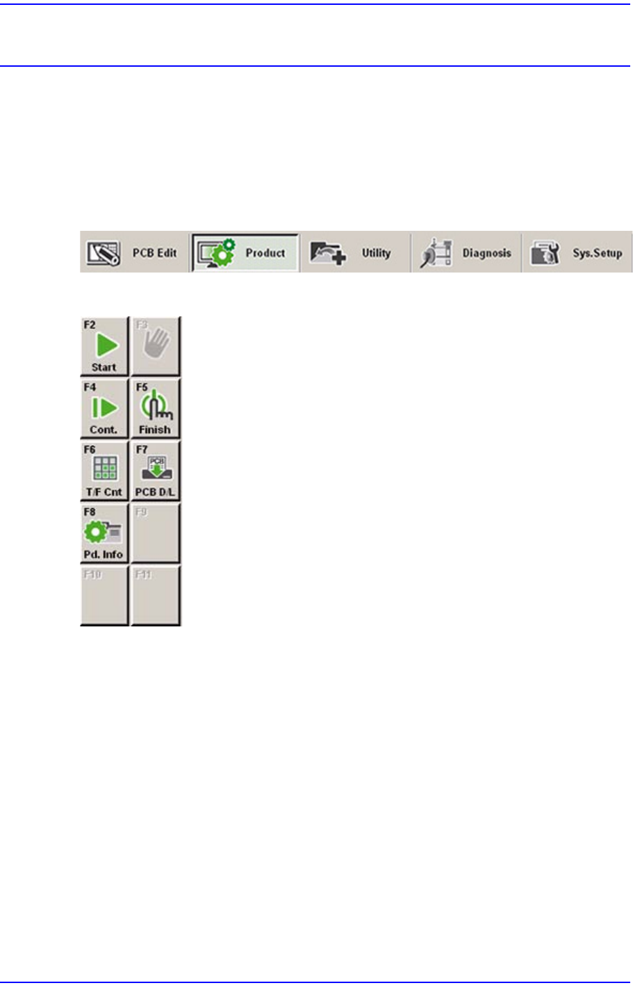 Product메뉴는 Start, Stop, Cont., Finish, T/F Cnt, PCB D/L, Pd. Info 등의 7개의 하위