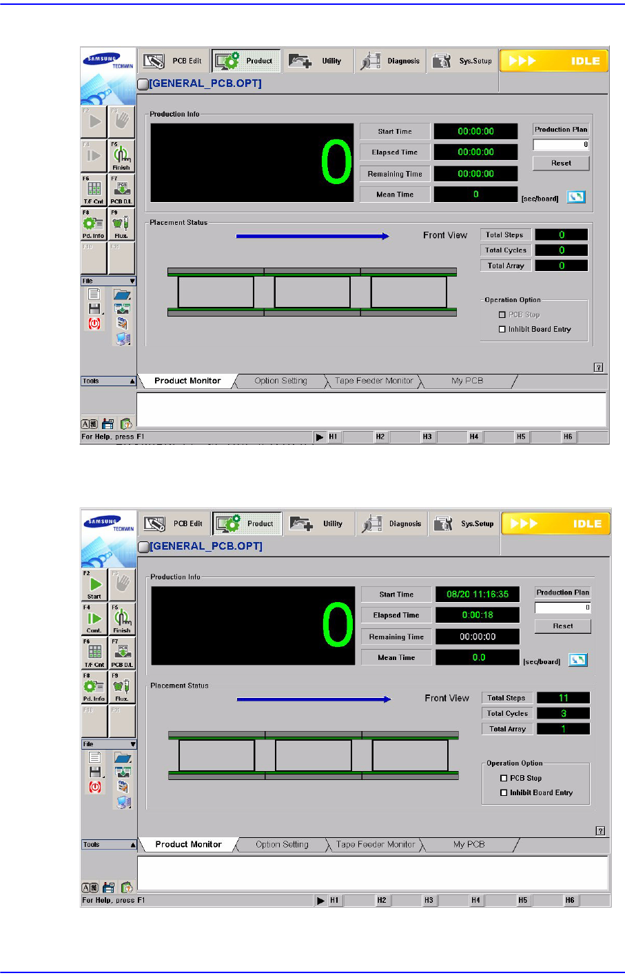 11-1 Production Setup 제 11 장 . Production Setup Product 메뉴는 Start, S top, Cont., Finish, T/F Cnt, PCB D/L, Pd. Info 등의 7 개의 하위 메뉴들로 구성되어 있 습니다 . 이 메뉴는 PCB (Printed Circuit Board / 프린트 기판 ) 장착작업을 수행하고 Monitor 하 는 기능을 수행합니…