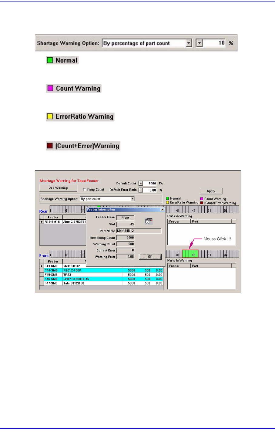 부품공급 에러발생율이 설정된 값 이상이 되는 Tape Feeder를 표시합니다 .